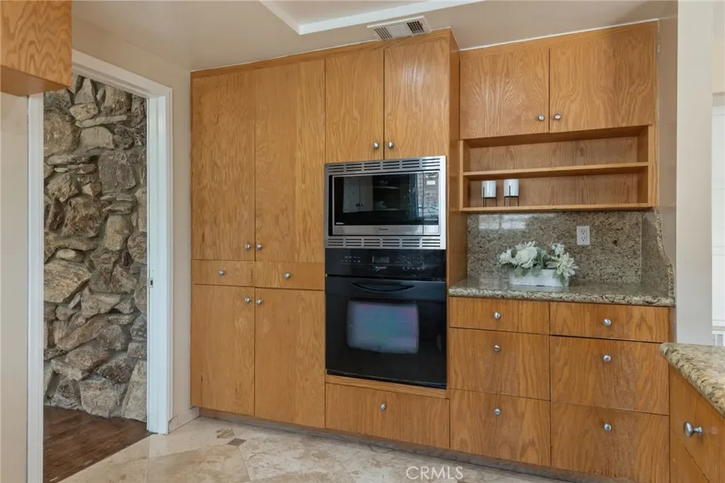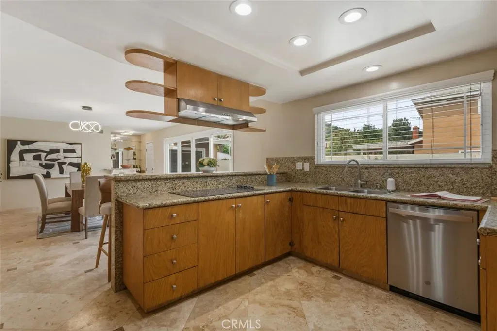 A grand double-door entry opens to a bright living room with a wood-burning fireplace. Travertine flooring flows into a spacious family room with wet bar and open-concept gourmet kitchen featuring granite countertops, modern faucet, updated electric cooktop, and LED recessed lighting—ideal for daily living and entertaining.
