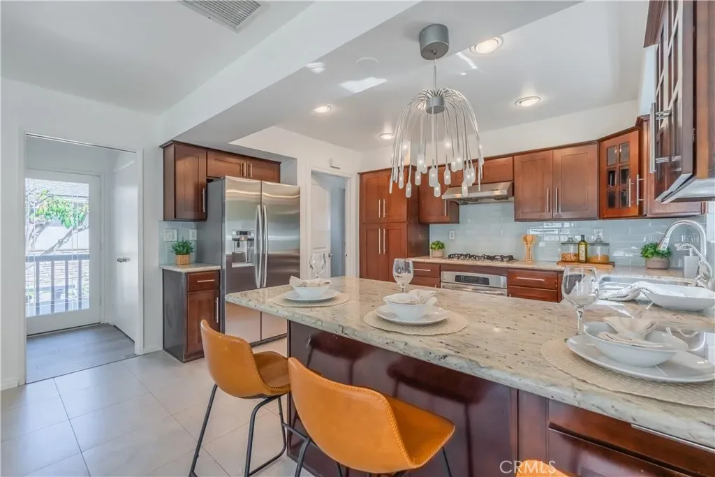 The newly remodeled kitchen features granite countertops, a built-in oven, separate 5-burner cooktop, center island, and lots of cabinetry. The kitchen opens seamlessly to the family room, complete with a cozy fireplace and sliding glass doors that overlook the expansive backyard.