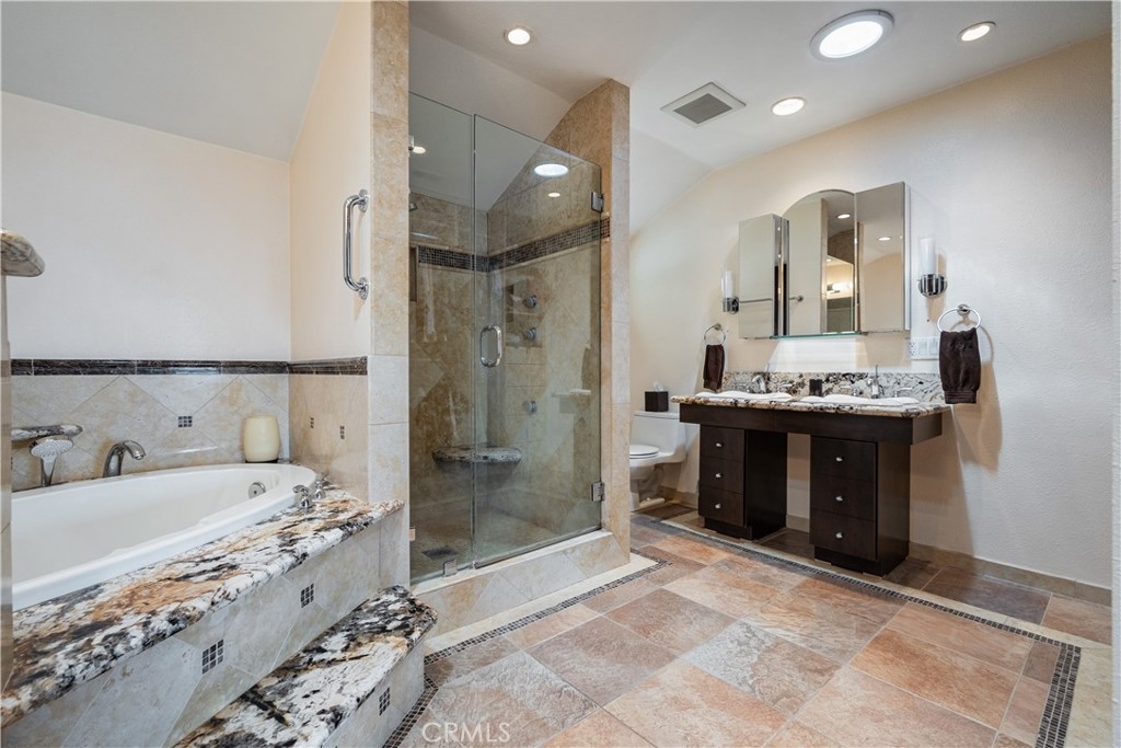 This home offers thoughtful upgrades throughout, including updated bathrooms with newer vanities and elegant granite finishes. Upstairs, the spacious primary suite is a true retreat, featuring a large sitting area and a beautifully remodeled bathroom with dual sinks, a separate vanity, luxurious jacuzzi tub, and skylights that fill the space with natural light.
