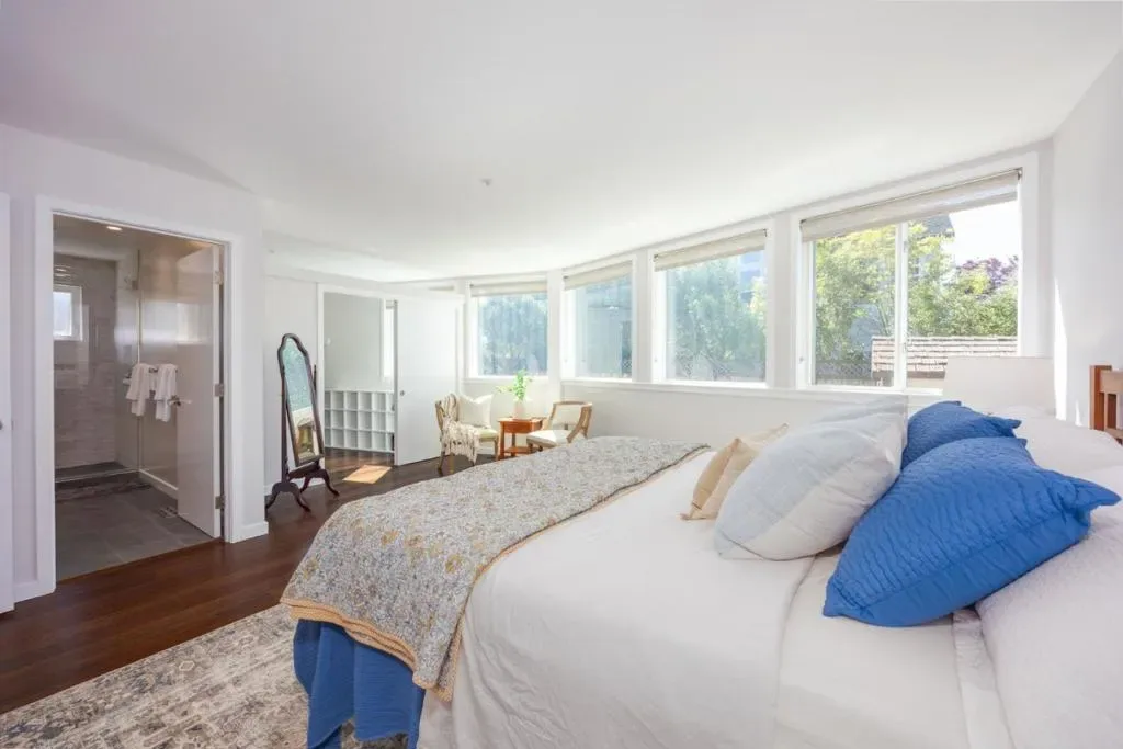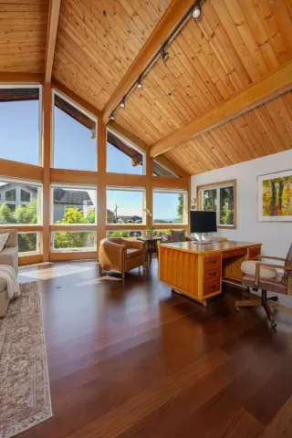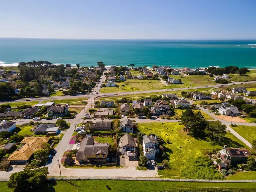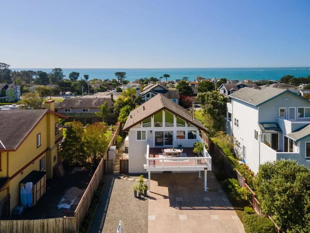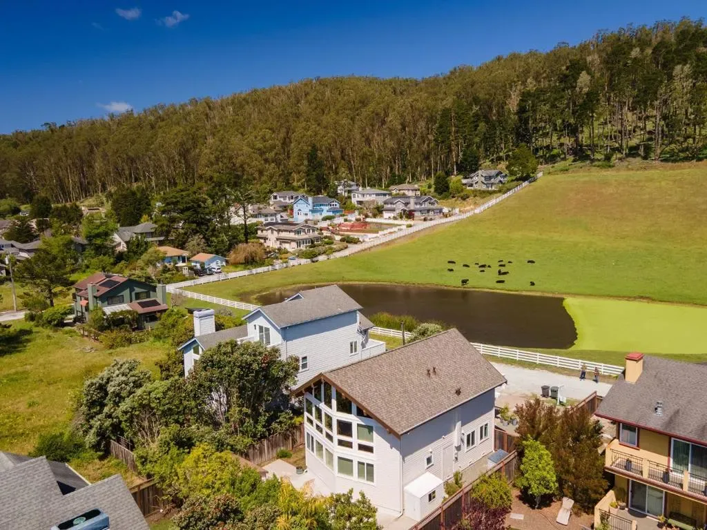 Sun-filled East Miramar home with panoramic views in both directions – unobstructed ocean and Pillar Point Harbor vistas to the west, and rolling pasturelands and Quarry Park to the east. Expansive windows and vaulted ceilings flood the upper level with natural light, framing sailboats returning to port and twinkling harbor lights after sunset. A second-story composite deck off the kitchen and dining area overlooks open pasture and forest – perfect for BBQs, al fresco dining, or relaxing in the sun. The reverse floor plan places main living areas upstairs for maximum impact, while the lower level offers a cool, restful bedroom retreat. The primary suite enjoys ocean breezes and distant wave sounds, with a custom bath featuring radiant heated floors. Brazilian walnut and porcelain slate flooring add warmth and texture. Many appliances are recently updated. Custom bird-safe glass enhances safety and sustainability. 4+ parking spaces offer flexibility for guests, a boat, or RV. Ideally located in East Miramar, blending peaceful rural surroundings with easy access to downtown Half Moon Bay, Quarry Park trails, Miramar Beach, Surfers Beach, Pillar Point Harbor dining and entertainment, plus a convenient commute to SF and the Peninsula. This is coastal living without compromise.