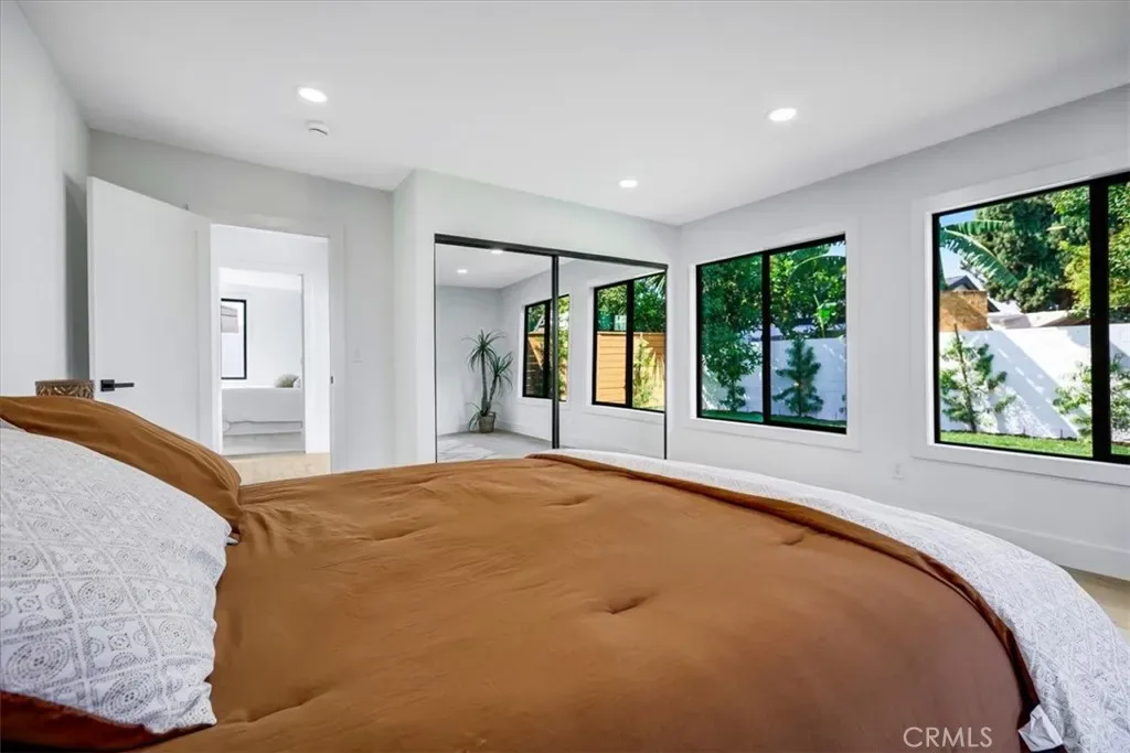 The layout offers multiple bedrooms arranged for both functionality and privacy. Two bedrooms and a full bathroom are positioned off the main hallway, while an additional wing of the home includes larger bedrooms, including a primary suite with an updated en-suite bathroom. Sliding doors provide direct access to the backyard and enhance the indoor-outdoor connection.