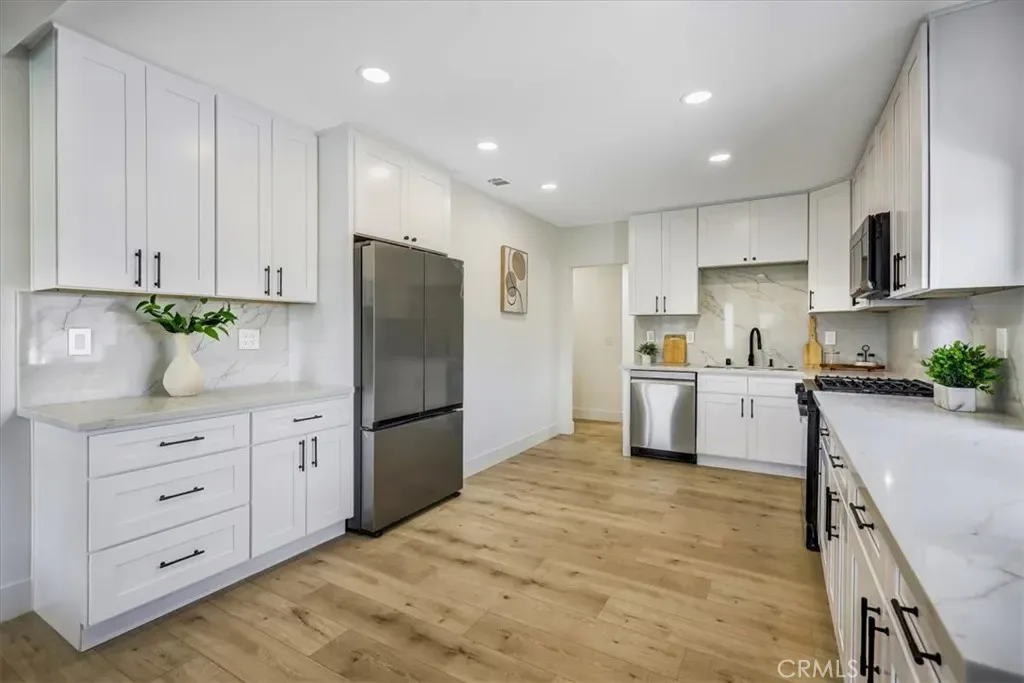 Inside, the home opens to a bright and cohesive living space with recessed lighting and a modern fireplace that anchors the room. The living and dining areas connect seamlessly to a fully updated kitchen, complete with white cabinetry, matching countertops, and a marble backsplash, creating a clean and contemporary design.