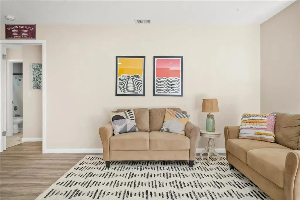 Discover this cozy two-bedroom, two-bathroom Condo in the vibrant city of Hayward. With 958 square feet of living space, the residence offers a practical layout with a dining area integrated into the living room, perfect for intimate gatherings. The kitchen is well-equipped, ready for meal preparation and enjoyment. The home features laminate flooring throughout, providing a sleek and easy-to-maintain surface. Stay warm during cooler months with central forced air heating, complemented by the inviting fireplace that adds a touch of charm. The property includes a washer and dryer, ensuring convenience for your laundry needs. Additionally, a security gate offers peace of mind. Situated within the Hayward Unified School District, this home is ideal for anyone seeking accessibility to local educational resources.