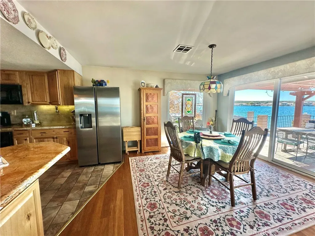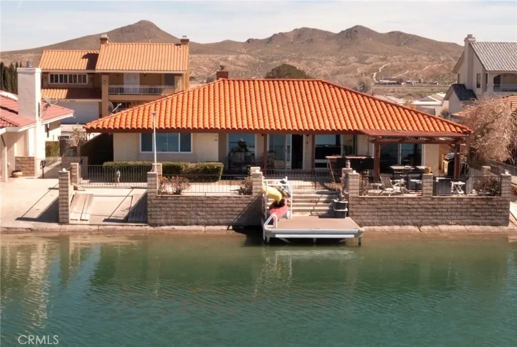 *JUST LISTED!* Encounter stunning sunset views ON THE OPEN WATER every evening from your back patio. If you have been looking for a house right on the lake, this may be the one. This charming 2 bedroom 2 bath home features a delightful courtyard entry area and a perfect layout with each bedroom and bath on separate sides of the home. The living room boasts gorgeous vaulted wood beam ceilings and a grand brick fireplace that looks out to glimmering lake views. It is truly an entertainer’s kitchen with custom tiling and oak cabinetry throughout. The dining area looks out onto the lake with 180 degree views and sliding glass doors for easy access to the back patio. The primary suite is exquisite, with spacious walk-in closet, custom shower and heated floors in the bathroom, sliding doors to patio, it’s own heating and cooling unit, and phenomenal water views every time you wake up. Lush landscaping and roses set the tone of the patio seating area in your new backyard paradise, ready for barbecues and entertaining. Mature olive, avocado, apple, cherry plum, and crepe myrtle trees surround the property and fresh star jasmine and lemon verbena are planted to delight your senses. The backyard includes it’s own deck on the water and boat launch! Aside from the great features at the house, you’ll also gain access to all of the wonderful community amenities of Silver Lakes including 27-hole championship golf course, pool, jacuzzi, tennis, pickle ball, and volleyball courts, outdoor recreation parks and fields, library, gym, equestrian center, and members only lake access.