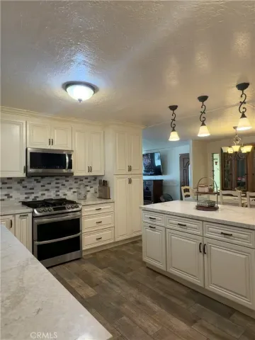Renovated kitchen with new appliances, updated cupboards, modern countertops, new garbage disposal, faucet, sink, and updated plumbing (including under the home and bathrooms).