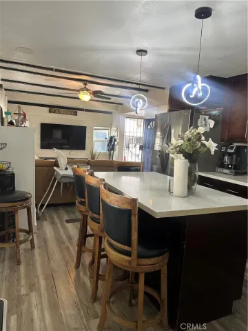 This charming home features an elegant and updated interior with beautiful beamed ceilings and laminate flooring. In addition this beautiful home provides a cozy environment while providing a spacious living and dining area well designed for any occasion. Transitioning from the living room you will step into a fully remodeled and elegant modern kitchen with a ceramic kitchen island and a built in microwave. Maintaining the modern interior of the home is an updated bathroom. Conveniently the laundry room is located outside. This home also has a BONUS ROOM!! Which means you have a spare guest room and/or office. In addition this home provides an incredibly spacious driveway for 4 cars! Making any celebration possible for your friends and family! This residence is located in a park with a clubhouse, library, and community pool. This home is perfect for first-time homebuyers.