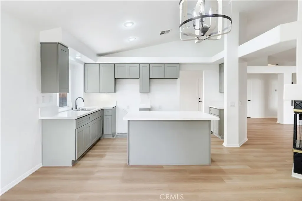 The interior offers a bright and inviting kitchen complete with quartz countertops, a center island with breakfast bar seating—perfect for both everyday living and entertaining. The living room features soaring ceilings, and a distinctive fireplace that is shared with the kitchen area, adding warmth and character to the home.