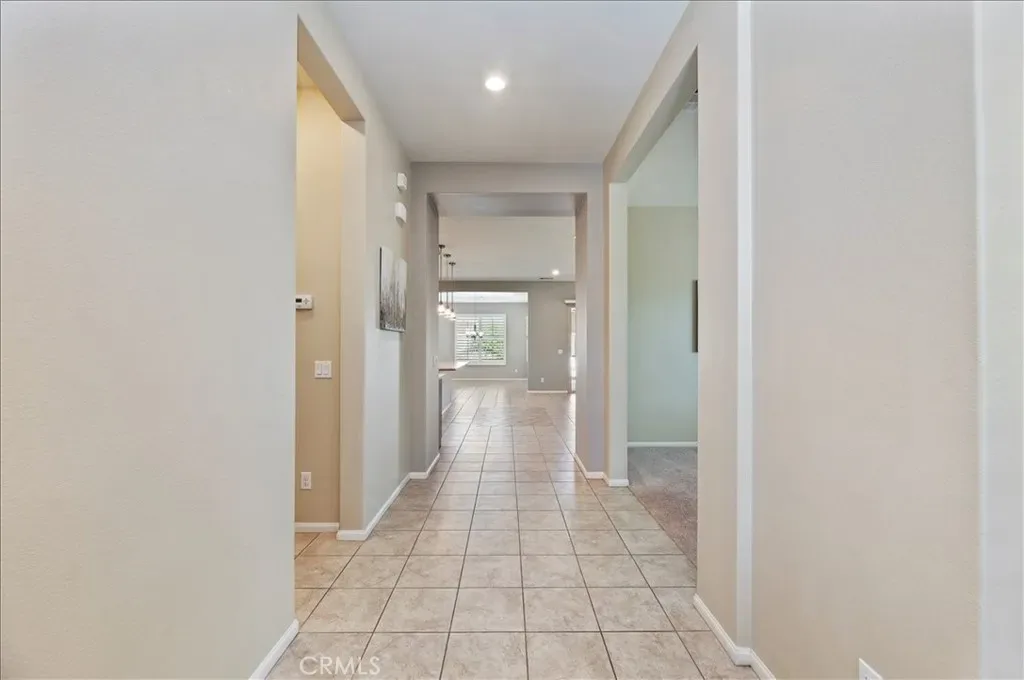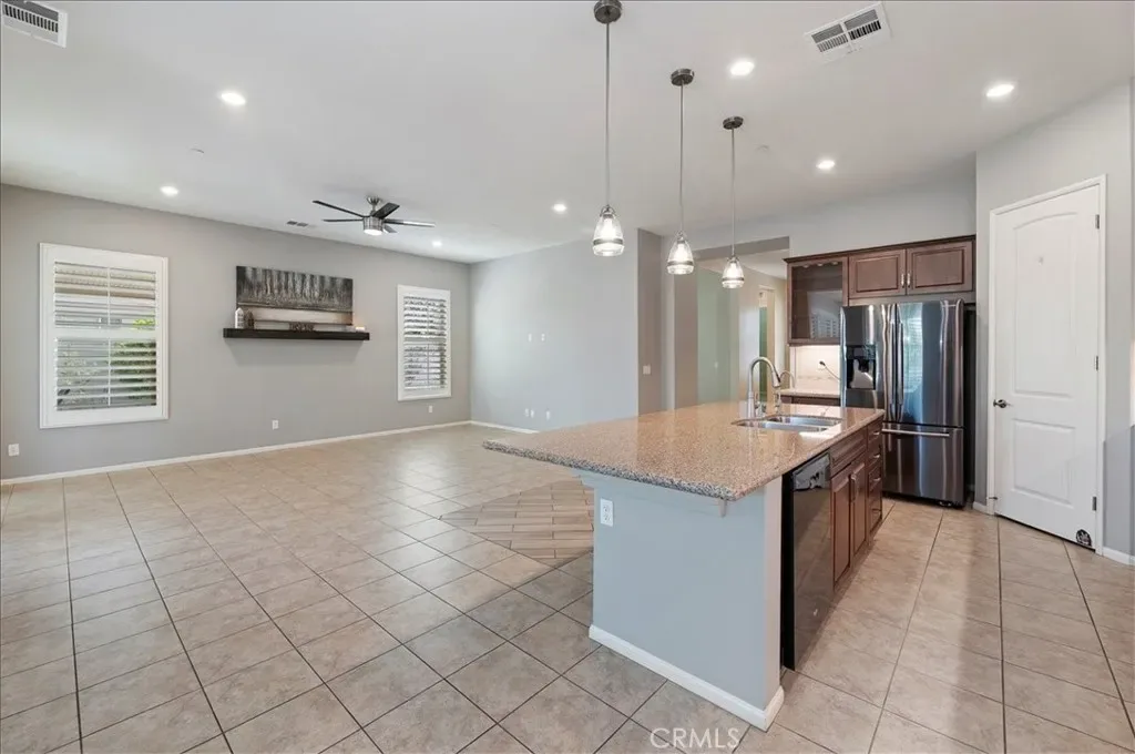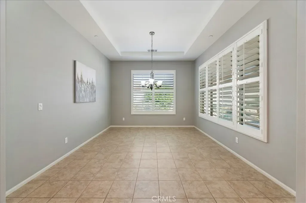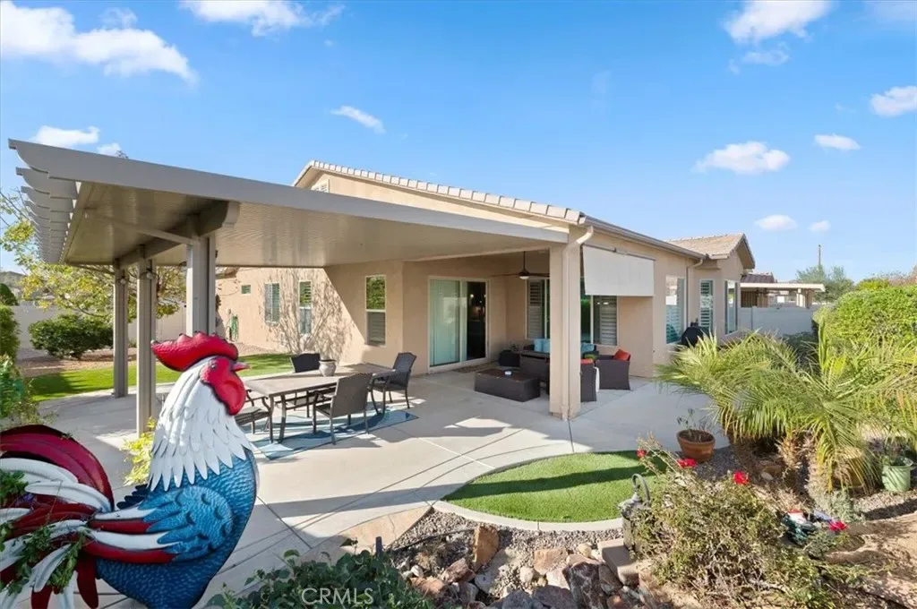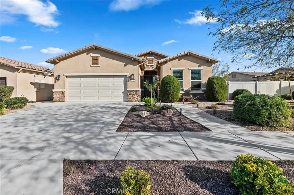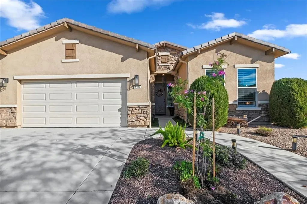 Welcome home to resort style living in the highly sought after 55+ Solera Diamond Valley community by Del Webb. This beautifully appointed Celebration model offers two bedrooms, two bathrooms, a formal dining room, and a versatile office or den (optional BR 3), perfect for work, hobbies, or guests. From the moment you arrive, you will appreciate the inviting curb appeal with drought tolerant, easy care landscaping, an added front walkway, and an elegant stone accented exterior that adds depth and character. Inside, the home showcases a designer feel with plantation shutters throughout, recessed LED lighting, soaring ten foot ceilings, ceiling fans in the living room, primary bedroom, and covered patio, plus ample hallway storage for added convenience. The thoughtfully designed floorplan offers both formal and open living spaces, including a separate living room, den, or office, and a formal dining room highlighted by a tray ceiling. The open concept kitchen flows seamlessly into the family room, making it ideal for entertaining. The upgraded kitchen features a large center island, granite countertops, black stainless steel appliances, accented glass front cabinetry, upgraded lighting, under cabinet lighting with dimmer, and a spacious pantry. The primary suite is a true retreat with desirable bay windows, an oversized walk in closet, and an ensuite bath offering dual sinks and a step in shower. A dedicated laundry room with additional storage adds convenience. Step outside to a backyard designed for relaxation and entertaining, featuring a large California patio with an extended covered area, ceiling fan, remote controlled shade screen, water feature, artificial turf, concrete curb borders, and easy care landscaping. The extended garage includes added storage racks for extra convenience. Living in Solera Diamond Valley means enjoying exceptional amenities, including a stunning community center with a fitness center and walking track, indoor pool, two outdoor pools, theater, library, billiards, conference rooms, bocce ball courts, tennis courts, pickleball courts, and a full calendar of daily, monthly, and annual social events that truly bring the community together. This home offers comfort, style, and an unmatched active adult lifestyle. Do not miss the opportunity to make it yours.