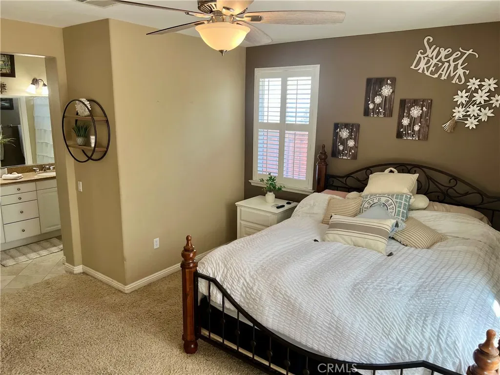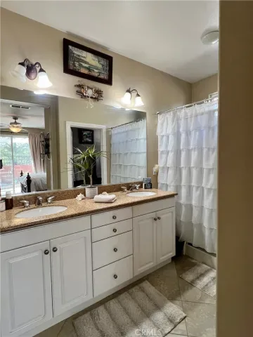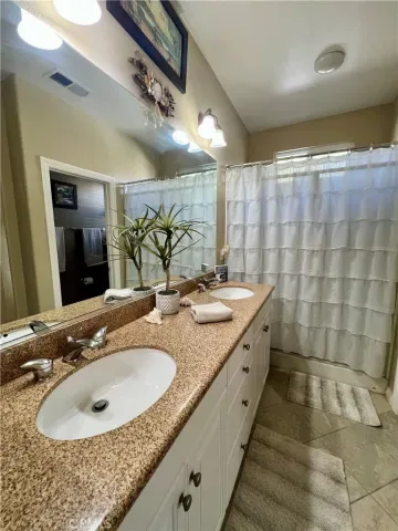 This home features two expansive primary suites, each with en-suite bathrooms and walk-in closets. One bathroom showcases dual white sinks and a walk-in shower, while the other offers a tub/shower combination—both echo the home’s sophisticated aesthetic.