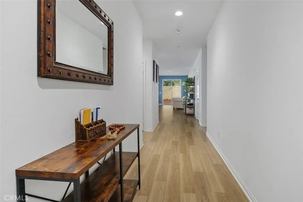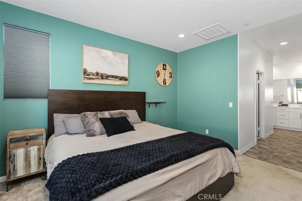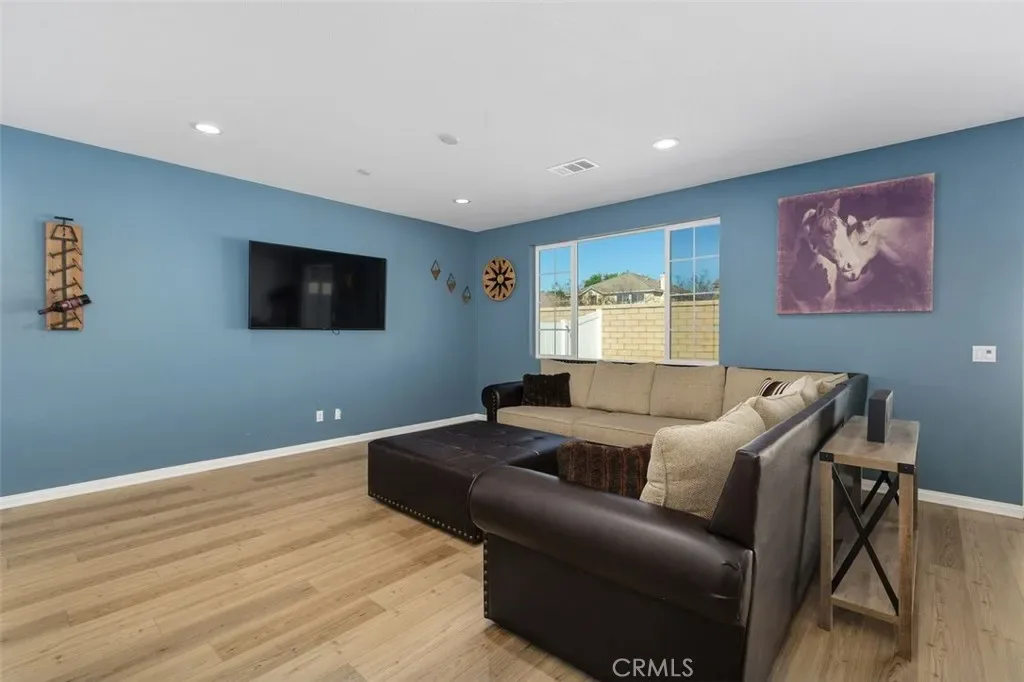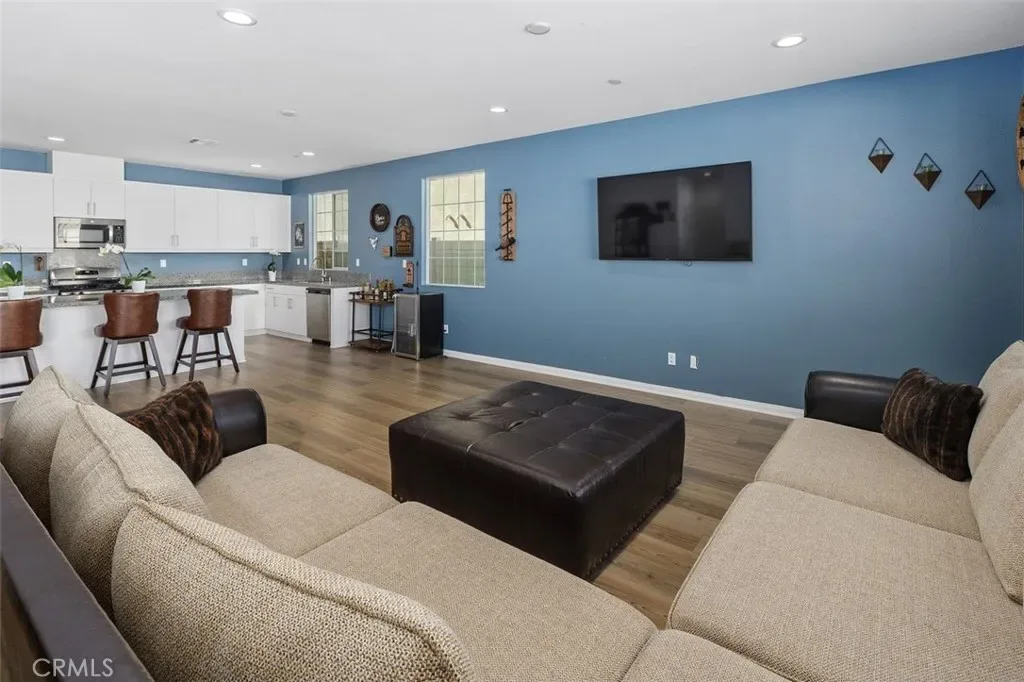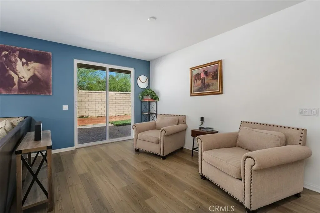 The gourmet kitchen showcases an expansive granite breakfast bar with seating for six, upgraded cabinetry with bespoke hardware, generous counter space, GE appliances, and impressive pantry. Seamlessly connected to the great room, it opens through a wide sliding glass door to the thoughtfully designed backyard—perfect for effortless indoor outdoor entertaining.