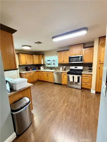 The spacious kitchen features granite countertops, stainless steel stove and dishwasher included, and a massive pantry. Step outside to a large backyard patio, perfect for entertaining, with mature fruit trees including apple and orange trees. The property also offers low-maintenance front and back yards and a 10×8 wooden storage shed.