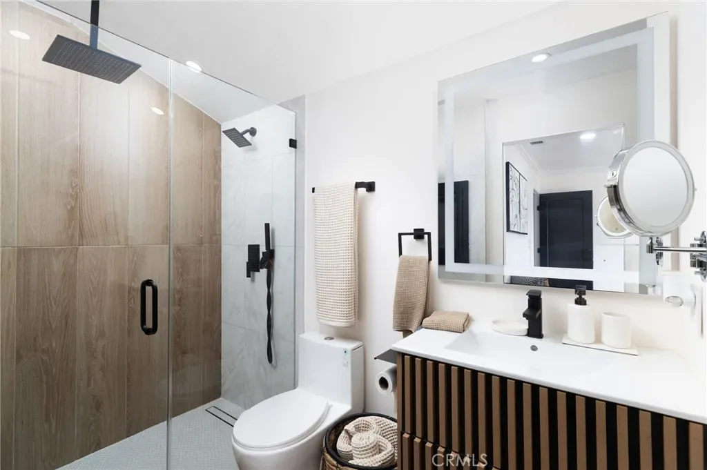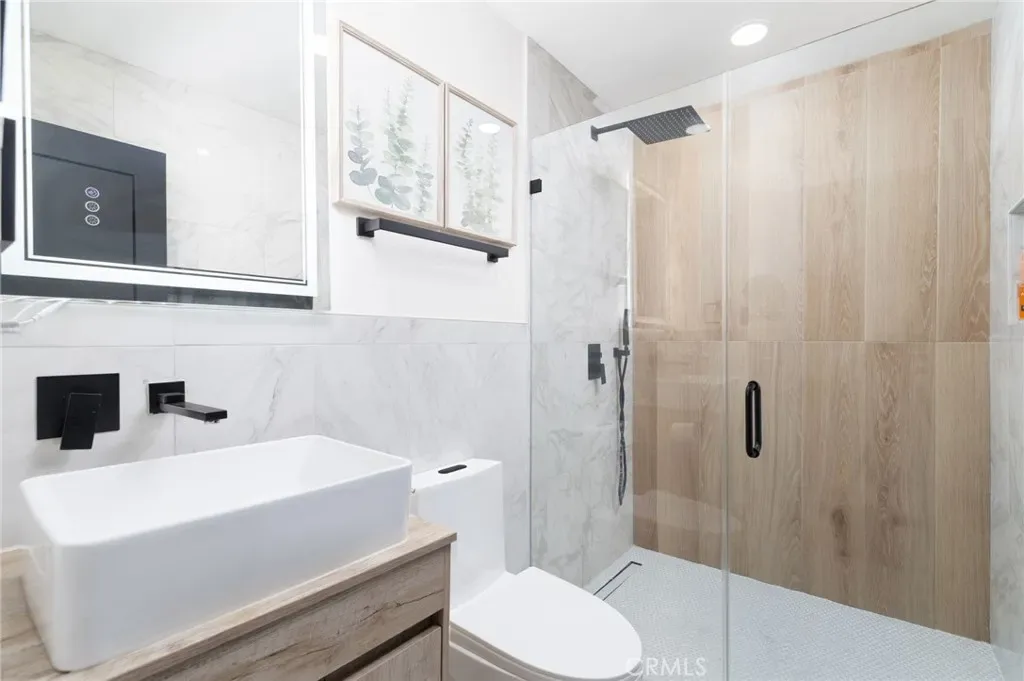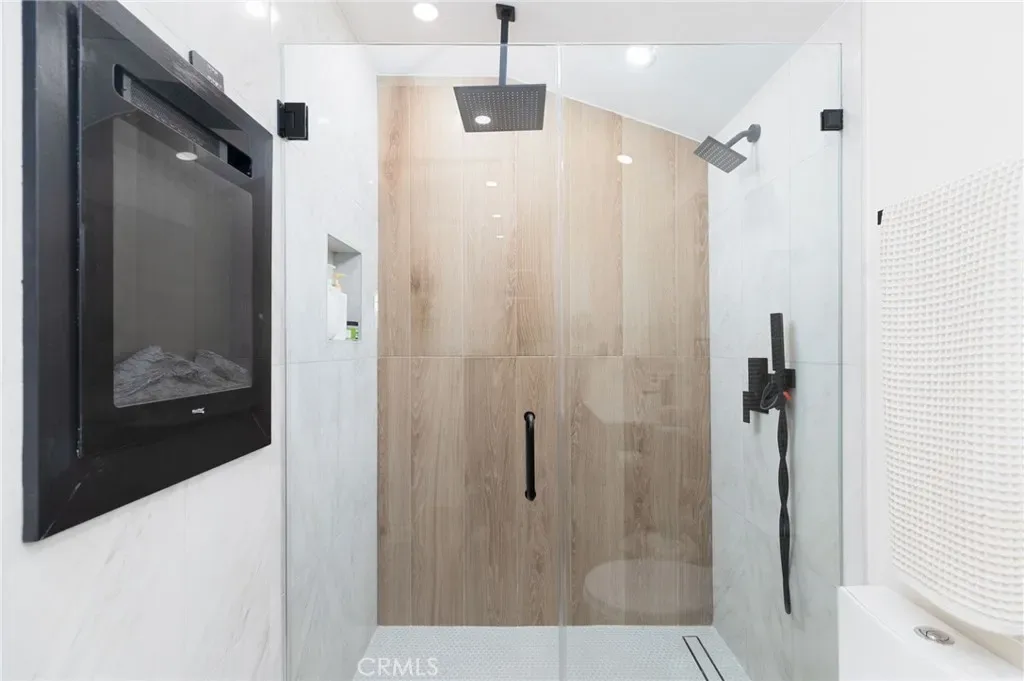 The remodeled bathrooms feature clean modern finishes, while the main living area bathroom showcases a rare built-in wall fireplace and stylish glass shower enclosure that creates a spa-like atmosphere.