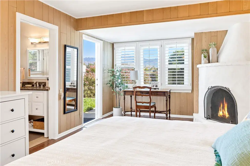 The spacious family room flows seamlessly to an additional patio, providing an inviting space for gatherings with family and friends. The private primary suite features two closets, a Hogan-style fireplace, ceiling fan, wood flooring, and direct access to the exterior. The primary bathroom includes a combination tub and shower with newer countertops.