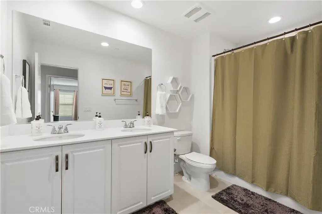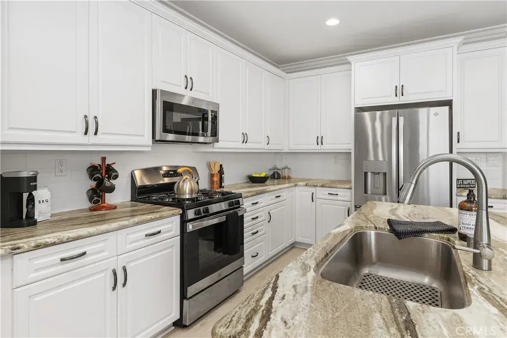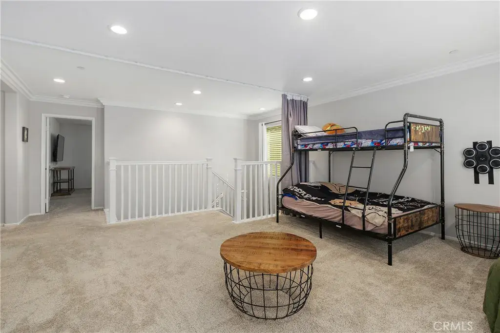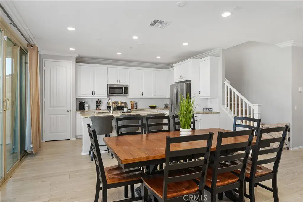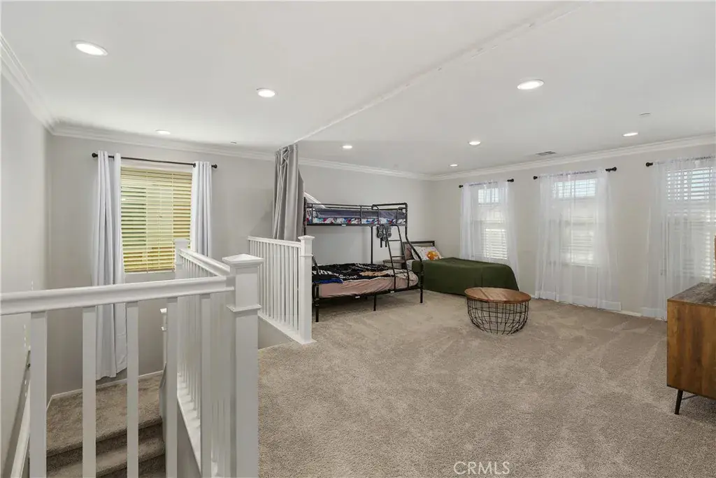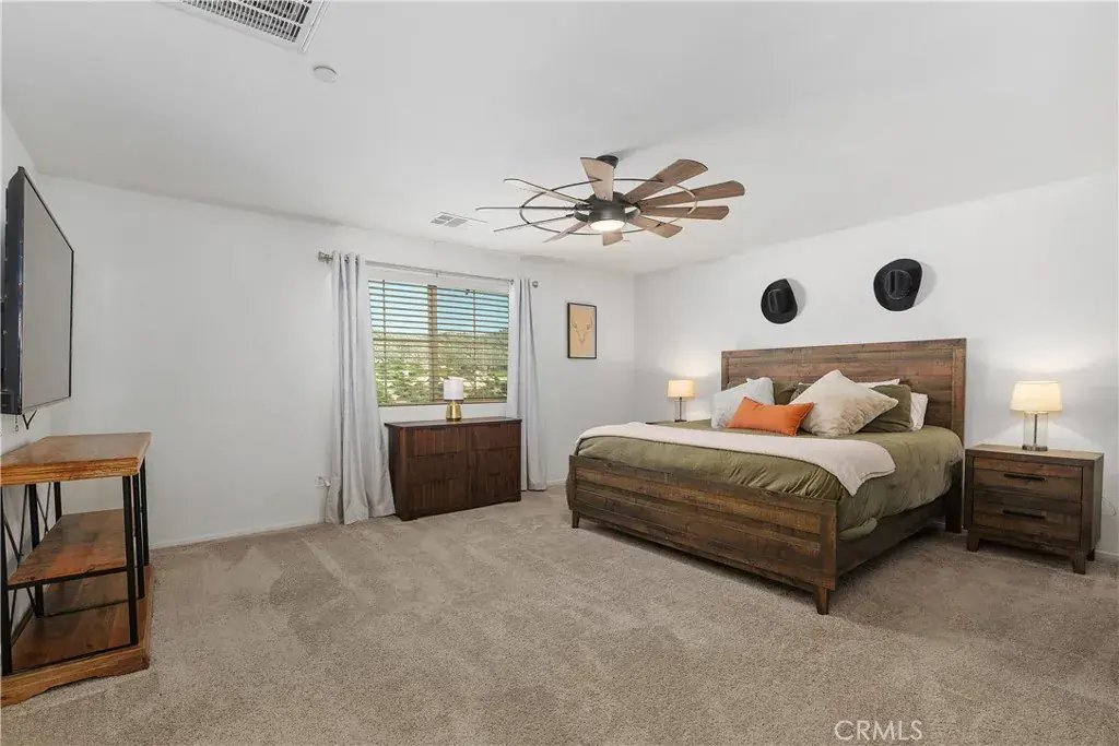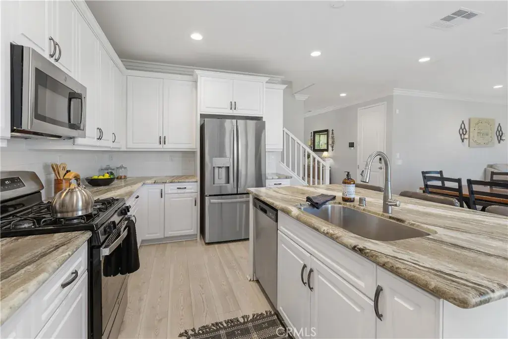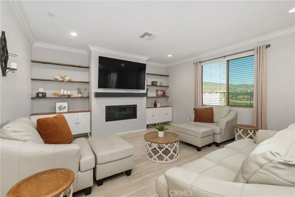This contemporary Mediterranean home blends classic Spanish Revival charm with clean modern lines, offering timeless curb appeal in the highly desirable McSweeny Farms community. Residents enjoy resort-style amenities including an expansive 18,000-sq-ft clubhouse with pool and spa, fitness center, basketball court, amphitheater, and scenic walking trails. Inside, the home is impeccably maintained and filled with natural light, featuring light LVP flooring, neutral carpeting, crown molding, and fresh, modern finishes throughout. The open-concept kitchen is the heart of the home, showcasing white soft-close cabinetry, striking marble-style quartz countertops, and seamless flow into the family room with a cozy gas fireplace. A versatile downstairs bonus room is ideal for a home office, studio, or flex space. Upstairs, a spacious loft complements three generously sized bedrooms, including a peaceful primary suite with a well-appointed en-suite bathroom. Step outside to enjoy a low-maintenance backyard with artificial turf, a covered patio, and breathtaking views of the Polly Butte mountain range. Additional highlights include a paid-off solar system with 15 panels, Tesla EV charging station, tankless water heater, and included refrigerator—offering comfort, efficiency, and modern Southern California living at its finest. Nearby Diamond Valley Lake and the Western Science Center add to the area’s recreational appeal.