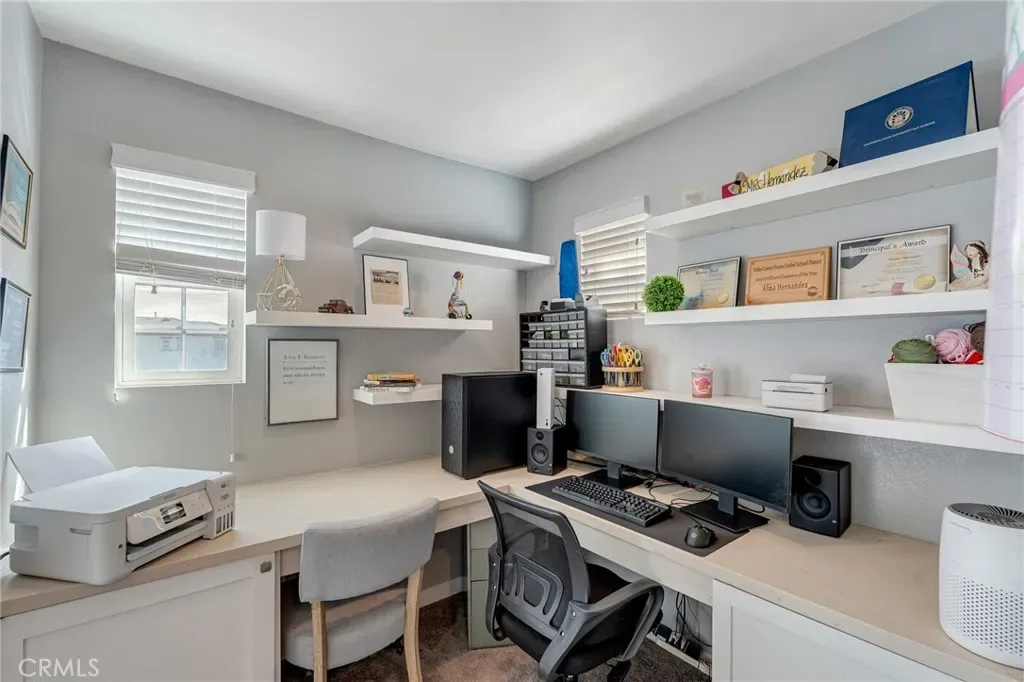 Enjoy the elegant quartz countertops featured in all three bathrooms, the kitchen, kitchen island, hallways, laundry room, and even the office—complete with built-ins and a sleek quartz workspace.