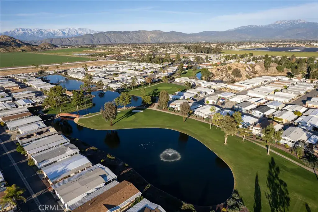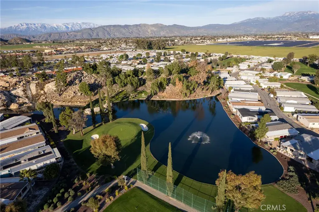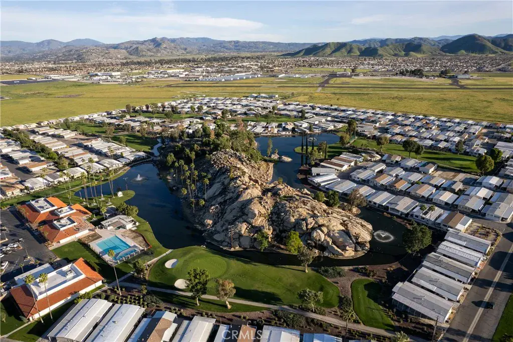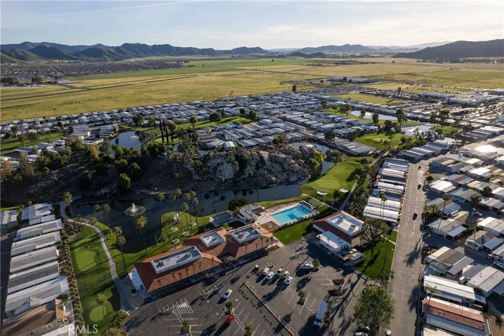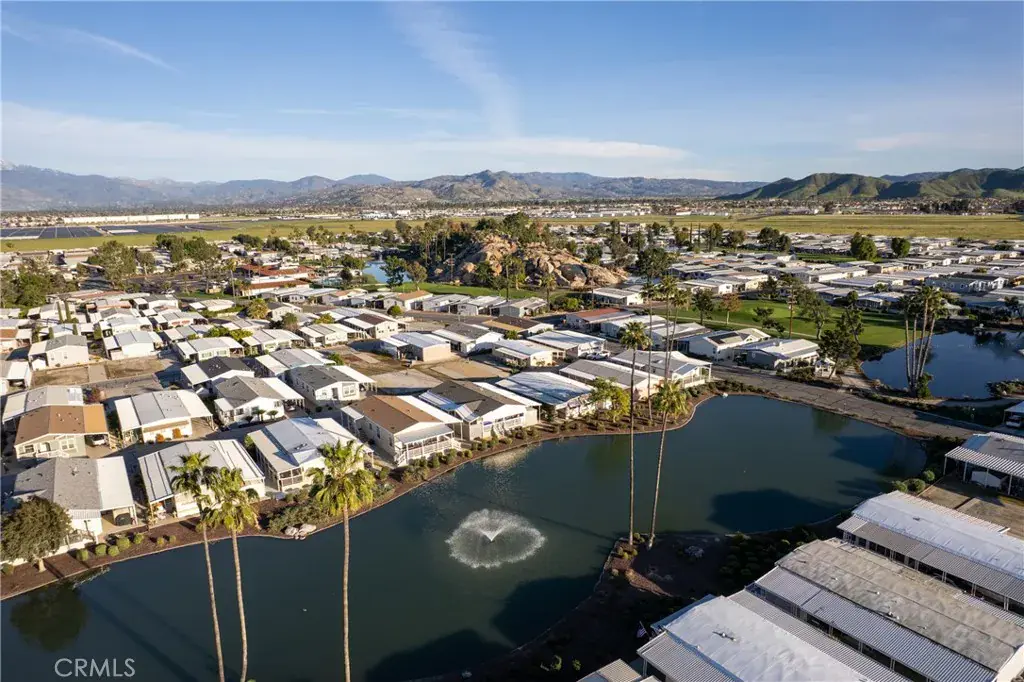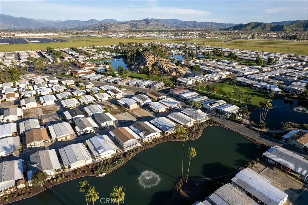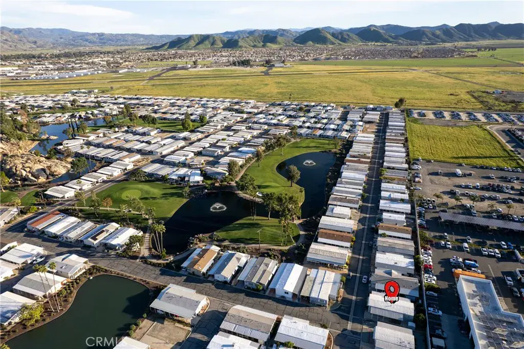 Well-maintained 2 bedroom 2 bath located in scenic The Lakes at Hemet West senior 55+ mobile home park. Formal living/dining combo with low-pile Berber carpet, ceiling fan, and built-in buffet hutch. Galley kitchen has gas cooktop, dishwasher, refrigerator, breakfast bar, and newer gas oven/boiler. Cozy family room with access to raised covered front porch. Master has ceiling fan, two closets, and dual-sink vanity with oversized stall shower. Inside laundry shelving, washer and dryer included. Guest bedroom as en suite full bath also accessible from main living area. Both HVAC and energy-saving evaporative cooling unit. Security screen doors. Roof resealed approximately 3 years ago and home was recently re-leveled. Extra tall carport accommodates higher-rise vehicles. Handicap accessible ramp. Easy-care rockscaping. Bearing fruit trees including navel oranges, loquat, and “cherry” guava. Park amenities include 9-hole par 3 Golf Course, heated pool and spa, indoor shuttleboard court, catch-and-release fishing, pickleball court, bocce ball, horseshoes, picnic area, playground, dog park, and community garden. Clubhouse and banquet room with kitchen facilities, billiard tables, fitness center, ceramics room, library/reading room, and community laundry. Hosted events. Monitored gate access. One of the nicest parks in the valley.