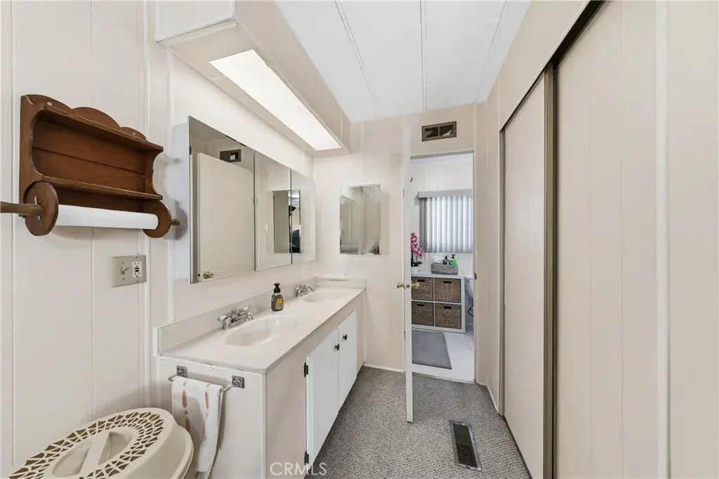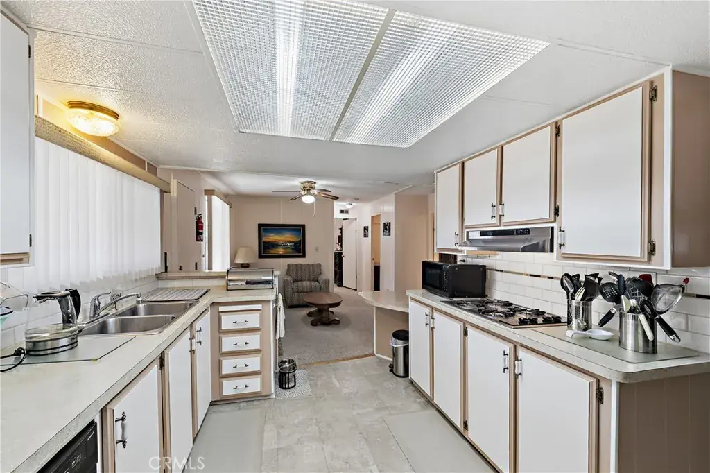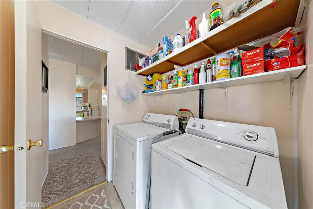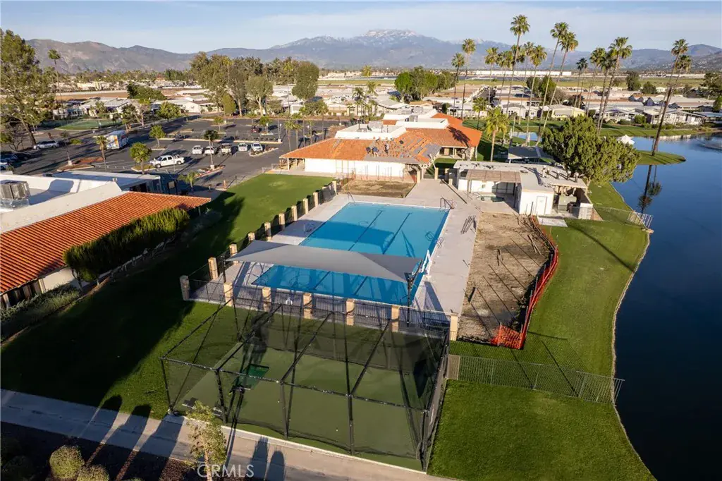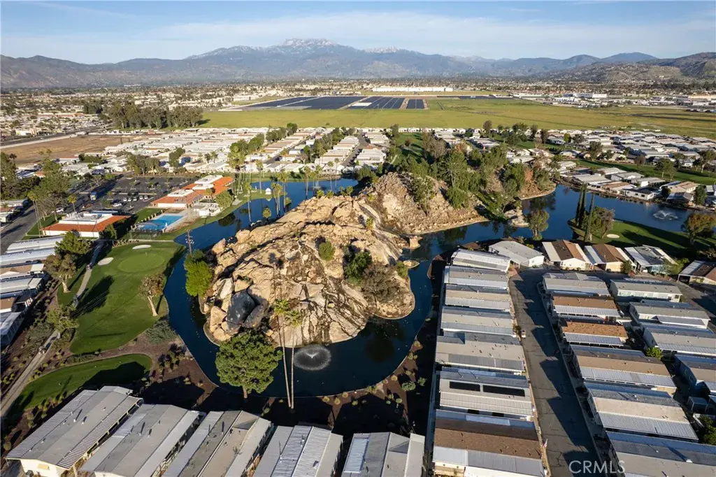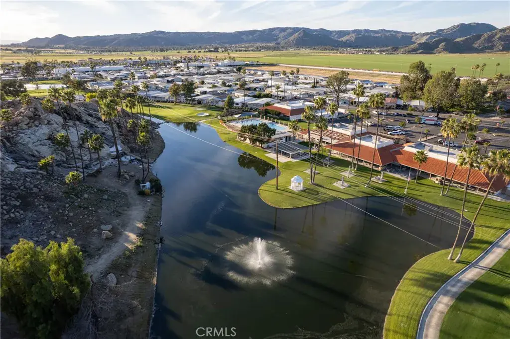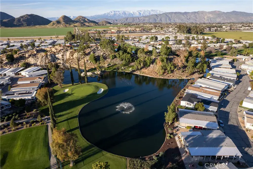 Well-maintained 2 bedroom 2 bath located in scenic The Lakes at Hemet West senior 55+ mobile home park. Formal living/dining combo with low-pile Berber carpet, ceiling fan, and built-in buffet hutch. Galley kitchen has gas cooktop, dishwasher, refrigerator, breakfast bar, and newer gas oven/boiler. Cozy family room with access to raised covered front porch. Master has ceiling fan, two closets, and dual-sink vanity with oversized stall shower. Inside laundry shelving, washer and dryer included. Guest bedroom as en suite full bath also accessible from main living area. Both HVAC and energy-saving evaporative cooling unit. Security screen doors. Roof resealed approximately 3 years ago and home was recently re-leveled. Extra tall carport accommodates higher-rise vehicles. Handicap accessible ramp. Easy-care rockscaping. Bearing fruit trees including navel oranges, loquat, and “cherry” guava. Park amenities include 9-hole par 3 Golf Course, heated pool and spa, indoor shuttleboard court, catch-and-release fishing, pickleball court, bocce ball, horseshoes, picnic area, playground, dog park, and community garden. Clubhouse and banquet room with kitchen facilities, billiard tables, fitness center, ceramics room, library/reading room, and community laundry. Hosted events. Monitored gate access. One of the nicest parks in the valley.