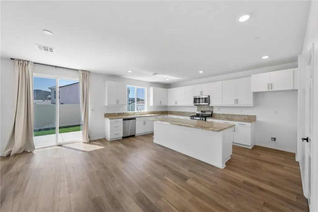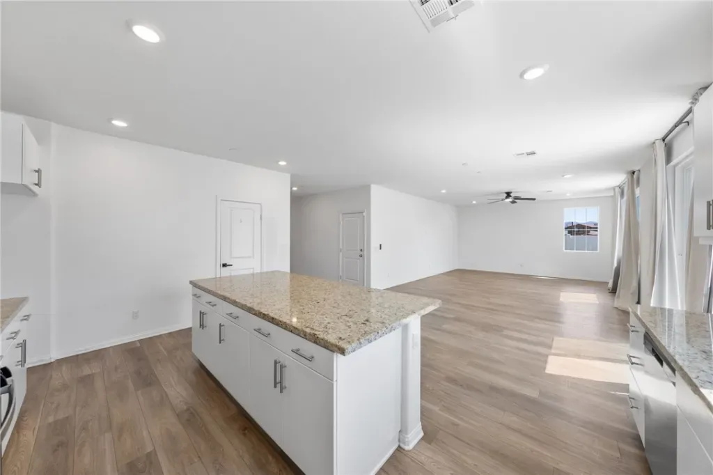 The main level showcases stylish vinyl plank flooring and an open-concept layout filled with natural light. The kitchen is a standout, complete with granite countertops, white cabinetry, and a generously sized walk-in pantry—perfect for everyday living and entertaining.
