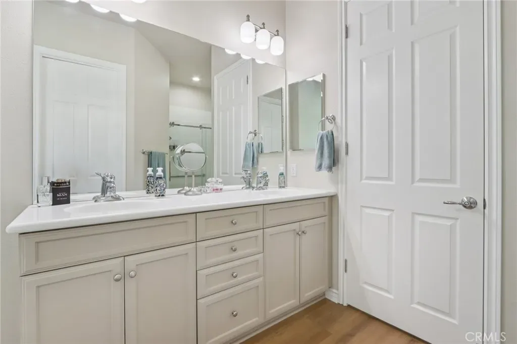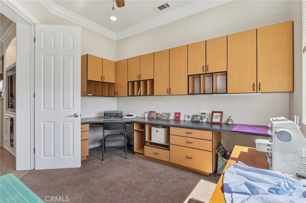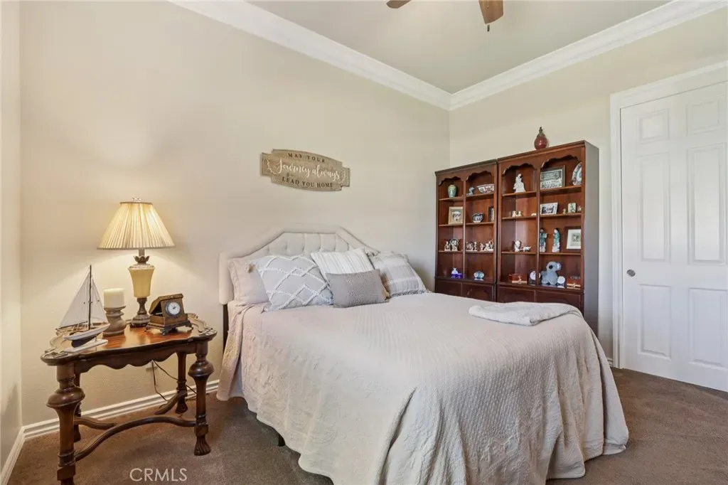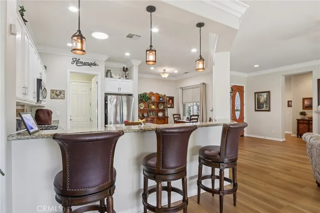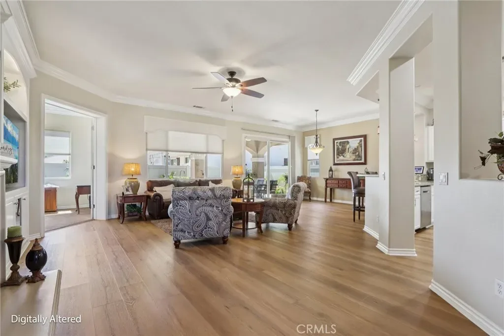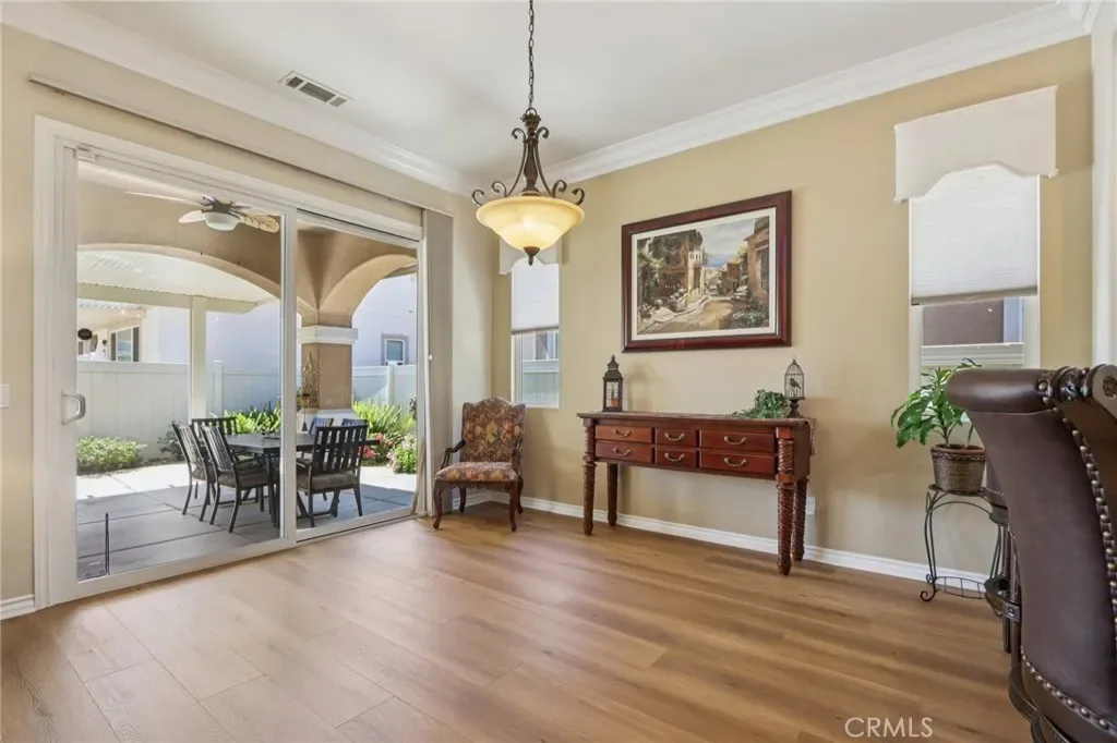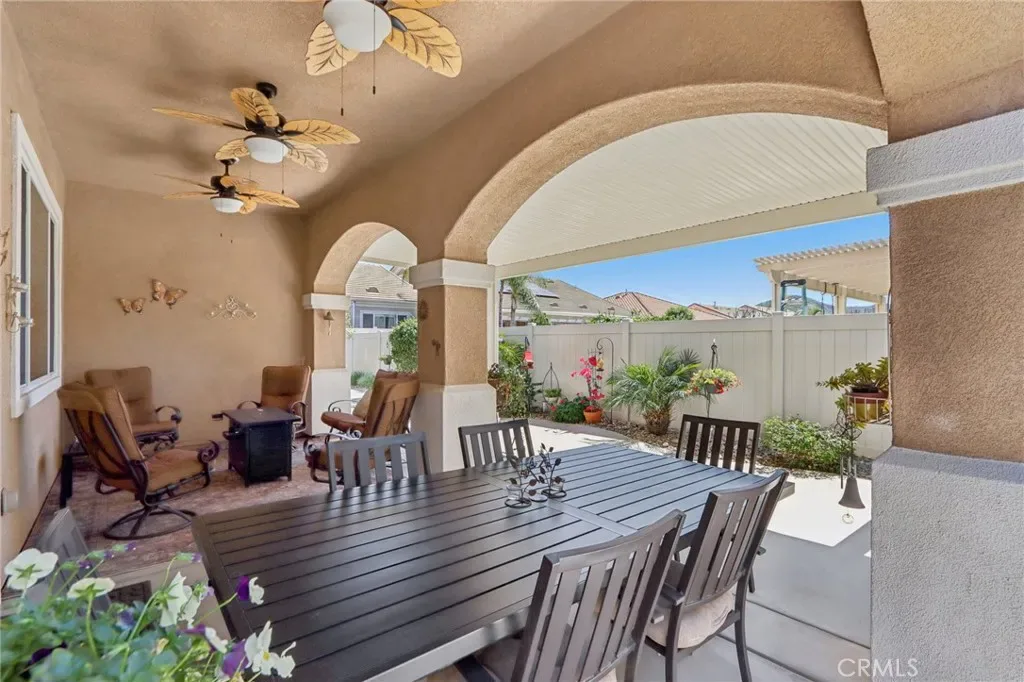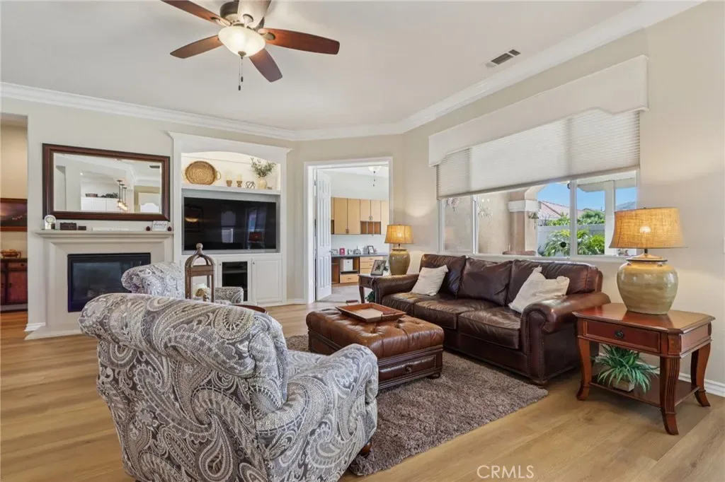 Welcome to this beautifully upgraded 1,851 sq ft, 2-bedroom, 2-bathroom home with a den/office, featuring 30 fully paid-off solar panels, located in the highly sought-after 55+ community of Solera Diamond Valley by Del Webb. Designed for comfort, elegance, and energy efficiency, this move-in-ready home offers the perfect blend of style and low-maintenance living. From the moment you arrive, you’ll be impressed by the gated front entrance, mature trees, and exceptional curb appeal. Step through the glass inlay front door into a spacious open-concept layout showcasing luxury vinyl plank flooring and crown molding throughout, creating a warm and sophisticated atmosphere. The heart of the home is the stunning kitchen, complete with granite countertops, matching stainless steel appliances, a large pantry, and a solar tube that fills the space with beautiful natural light. Just off the kitchen, enjoy a cozy breakfast nook for everyday dining, along with a formal dining area ideal for entertaining guests. The inviting living room features a built-in entertainment center and a cozy fireplace, perfect for relaxing or hosting. French doors open to a versatile den/office, ideal for working from home, hobbies, or additional guest space. The spacious primary suite offers a peaceful retreat, complete with ample storage and a beautifully appointed en-suite bath featuring a convenient step-in shower. The secondary bedroom is well-sized for guests and located near a full second bathroom. Additional interior highlights include a dedicated laundry room with built-in cabinetry and utility sink, as well as a whole-home water softener system for added comfort and efficiency. Step outside to your private backyard oasis, featuring immaculate landscaping and a California-style covered patio with a durable Alumawood patio cover—perfect for enjoying outdoor living year-round. Additional upgrades include refrigerator, washer, dryer and TV included, along with designer fixtures that elevate the home’s style and functionality. And to top it all off, the home comes equipped with 30 fully paid-off solar panels, offering long-term energy savings and peace of mind. The amazing community center has: a workout center with walking track, a library, billiard tables, conference rooms, theater, indoor pool and spa, two outdoor pools and spa, Bocce ball courts, tennis courts and pickle ball courts. The community has daily, monthly and annual events that brings the community together.