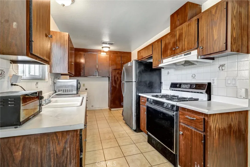 The efficient galley kitchen provides ample cabinet storage, a gas range/oven, laminate countertops with tile backsplash, a pantry, and convenient in-kitchen laundry with upper cabinets and a gas dryer hookup. The garage features a door opener with direct access into the home, and the long concrete driveway offers PLENTY of additional parking.