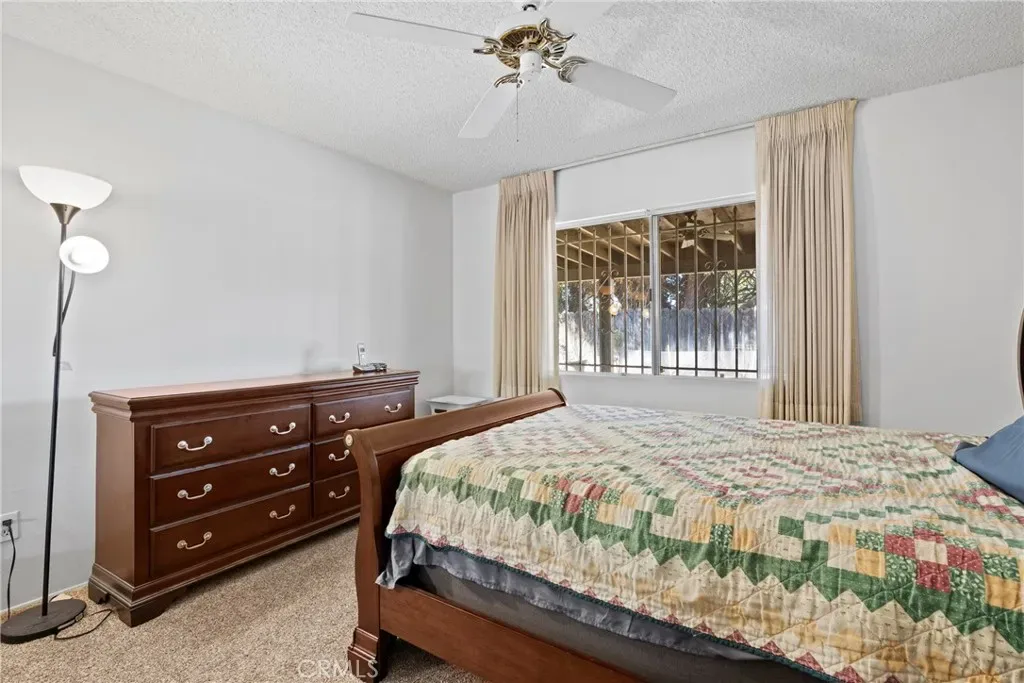 Features include a new water heater installed in 2024, ceiling fans in the bedroom and kitchen, a tile entry, and comfortable carpet in the living area. The master bedroom features a sliding glass door that opens to the backyard, providing easy outdoor access and natural light.