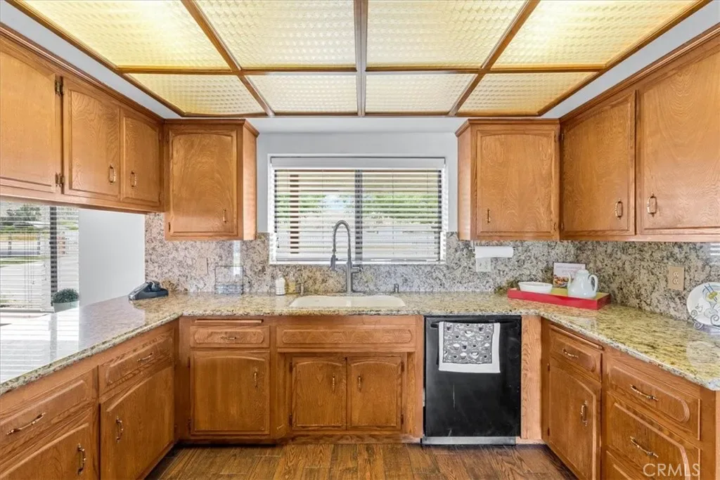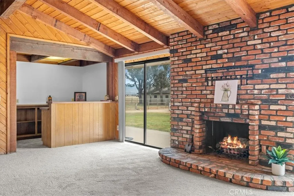 The home boasts a well-appointed kitchen with ceramic countertops, double ovens, a 5-burner cooktop, and a built-in microwave. Enjoy generous living areas including a huge living room and a separate family room with a cozy wood-burning fireplace, accented by beautiful wood-beamed ceilings and custom wood wall finishes. Two double glass doors provide seamless access to the backyard, enhancing indoor-outdoor living.
