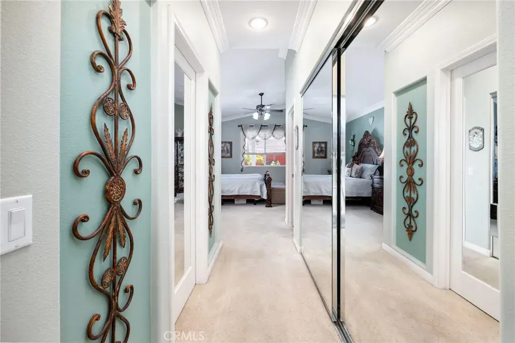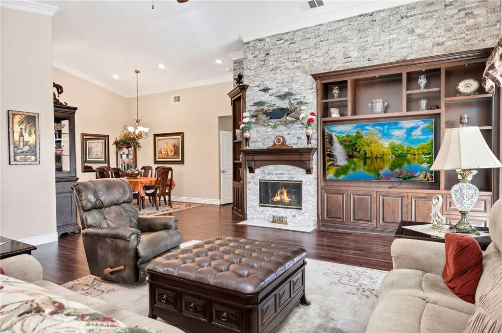 Situated within the 55+ guard-gated community of Four Seasons at Hemet, this highly sought-after and popular floorplan offers the perfect blend of functionality, comfort, and upscale finishes. This home within the tract has the additional savings bonus of NO MELLO-ROOS. With 2 spacious bedrooms plus a versatile den that can easily serve as a third bedroom, hobby room, or home office, this layout is one of the community favorites due to its open flow, generous living areas, and thoughtful separation of space. From the moment you arrive, the upgraded curb appeal sets the tone. The front elevation features custom flagstone accents, a river rock design element, and low-maintenance artificial turf, creating a polished and water-conscious landscape. Inside, the home showcases high ceilings, elegant crown moulding, and wood laminate flooring throughout most of the interior, enhancing both continuity and visual appeal. The expansive living room is centered around a fireplace with custom flagstone surround and a beautifully crafted built-in entertainment wall, offering both architectural interest and practical storage. The kitchen is designed for everyday living and entertaining alike, complete with granite countertops, a center island, stainless steel appliances, and abundant cabinetry. The open-concept design allows seamless interaction between the kitchen, dining, and living areas—one of the reasons this floorplan remains in high demand within the community. Significant system upgrades provide long-term value and peace of mind, including a recently replaced A/C system (May 2024) and furnace (March 2023). The home is equipped with solar under a power purchase agreement, with the seller reporting no current monthly payment to the solar provider. Additionally, a Tesla battery backup system is installed in the garage for added energy efficiency and reliability. The garage itself is upgraded with epoxy flooring and built-in storage cabinets, creating a clean, organized workspace. In the backyard, you’ll find a large Alumawood patio cover, providing shaded outdoor living space ideal for relaxing or hosting gatherings year-round. Residents of Four Seasons enjoy resort-style amenities including a clubhouse, fitness center, pool and spa, tennis courts, pickleball, walking trails, and a full calendar of social activities—all for a reasonable HOA of $214 per month. The community is guard-gated and meticulously maintained, offering both security and an active lifestyle.