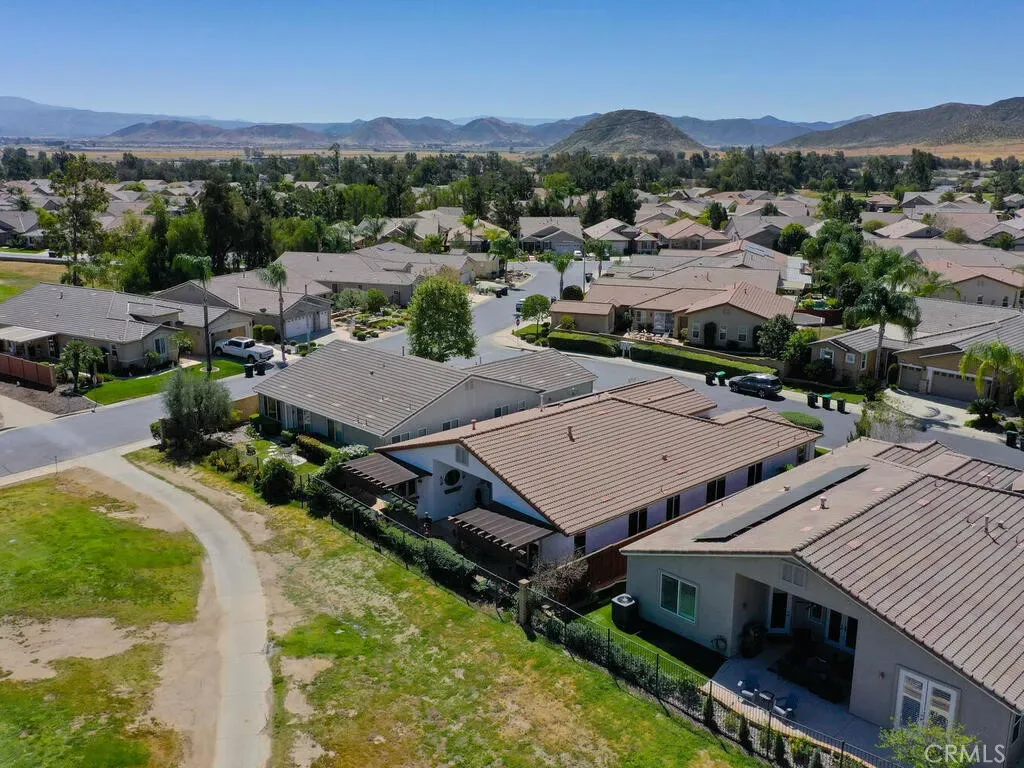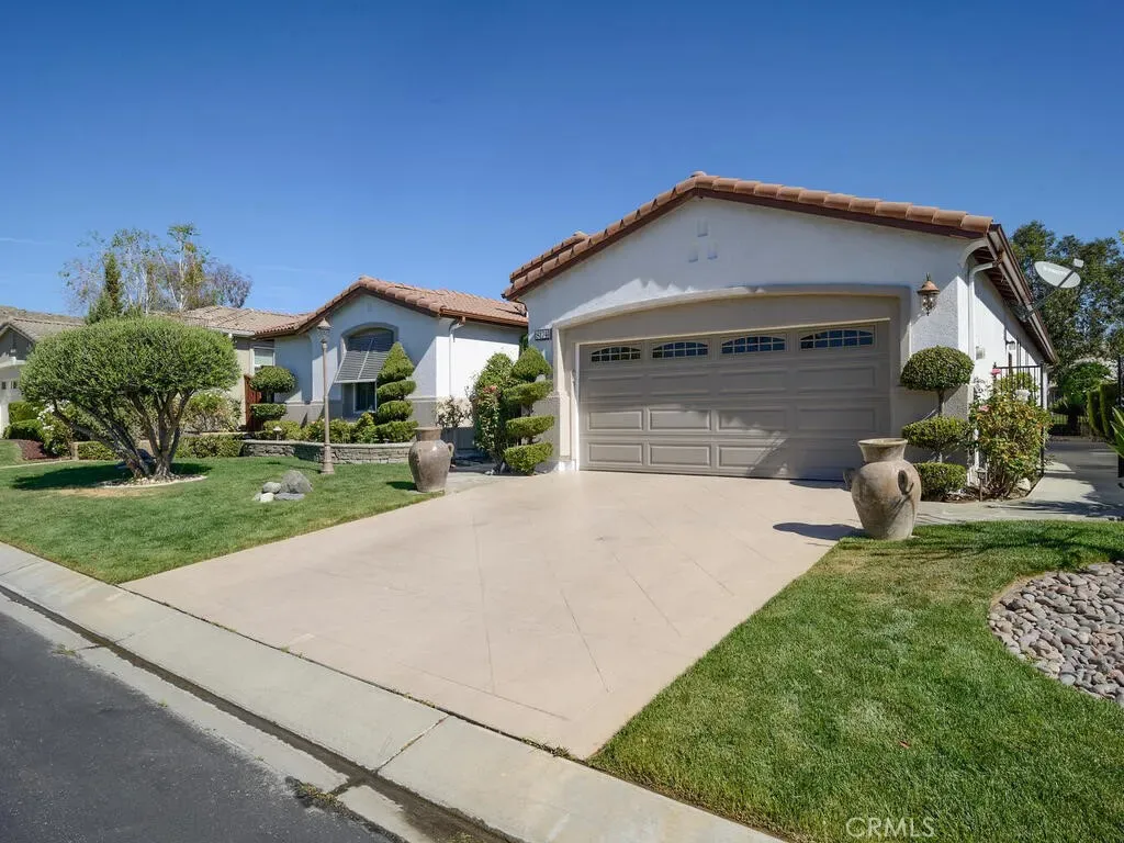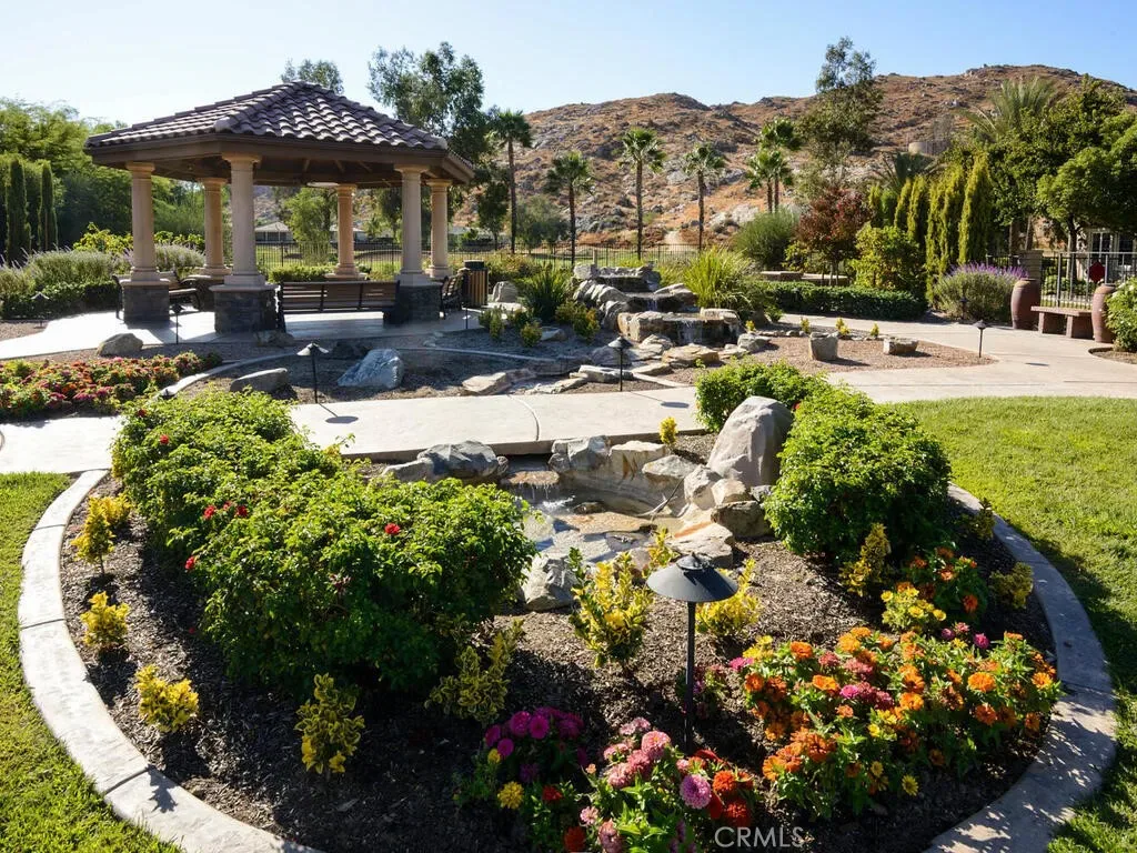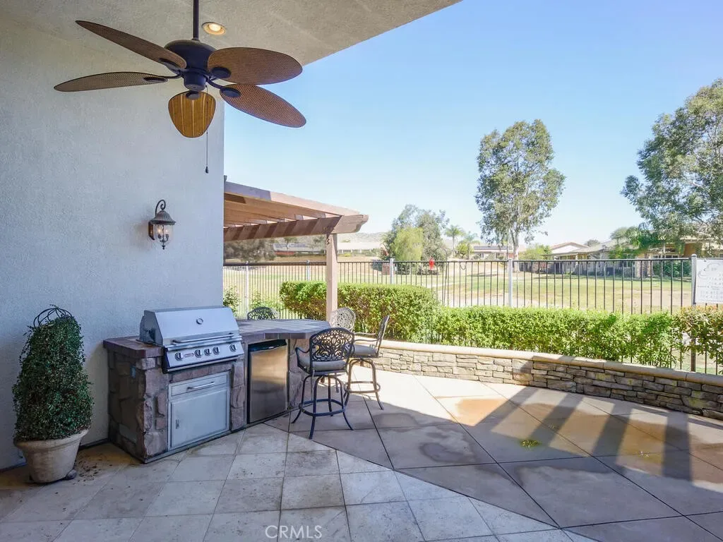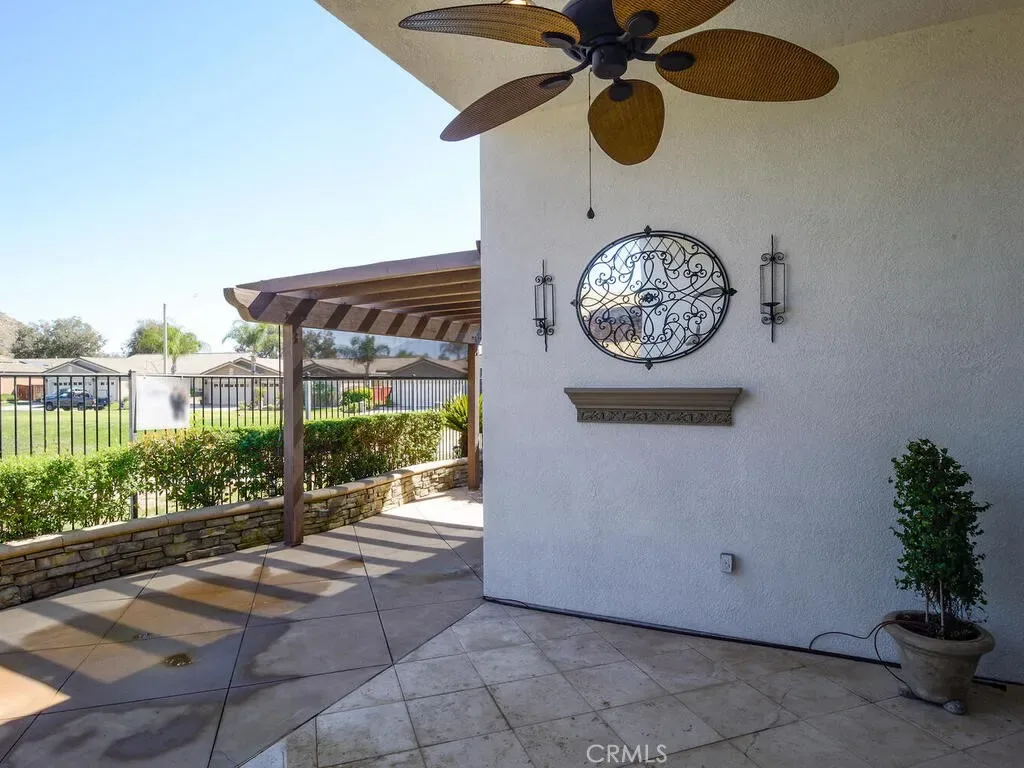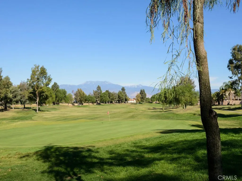 Championship Plan 3, the largest plan in the community, which has 3 bedrooms, and 3 bathrooms, plus an office, in 2755 square feet. The home is located in the highly sought after Four Seasons of Hemet, with view of the 13th tee box right outside the rear patio. This home has been highly upgraded in so many ways, but to list just a few designer touches, all the woodwork has been replaced with rich dark wood, the doors are all arched to add to the theme of an Italian Tuscan villa, all cabinets, and many built ins are designer grade. The tile flooring has several designs from the foyer through the living room to the huge French doors out to the back patio. Notice the coffered ceilings The primary bedroom closets are oversized and have thoughtfully designed closet organizers installed, and there is a jetted spa tub to relax away all your worries. In addition to all this, there is PAID OFF SOLAR. Be sure to tour The Lodge, and experience the amenities, which include The Bistro, onsite restaurant with sit down service, billiards, movie theater, library, craft room and game rooms. The huge ballroom is always busy getting ready for the next program being held there…Banquets, bingo, live productions, dancing and much more. Outside the Lodge, we find the open patio area, offering concerts and summer programs, the pool with exercise classes or lap swimming, the gym building with hair salon. Behind the gym building, you find the shuffleboard, bocce ball, tennis and pickleball.