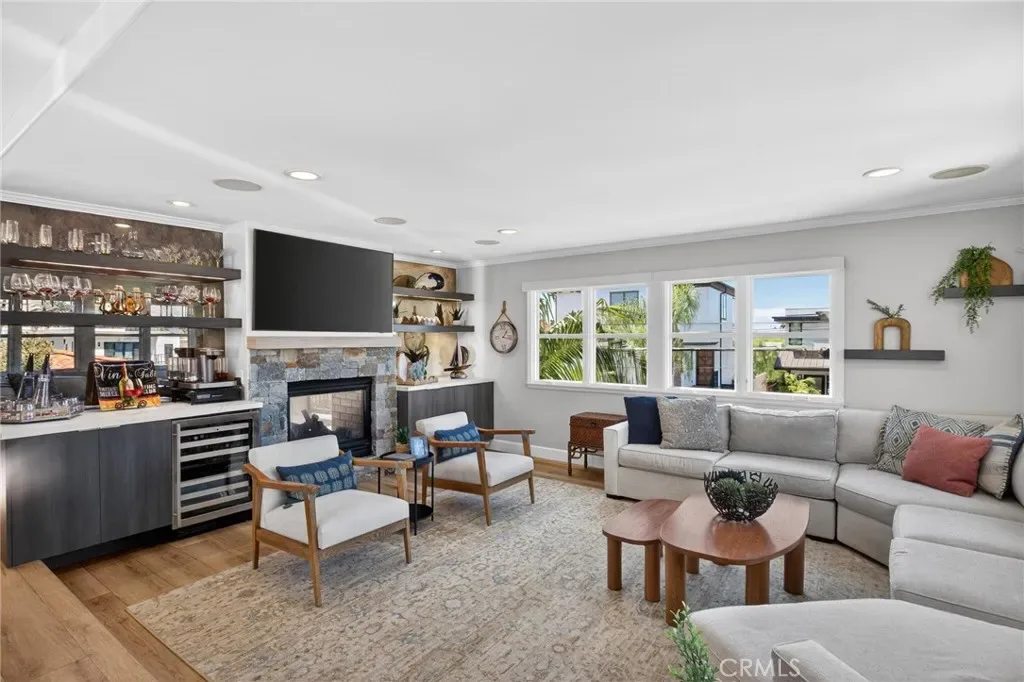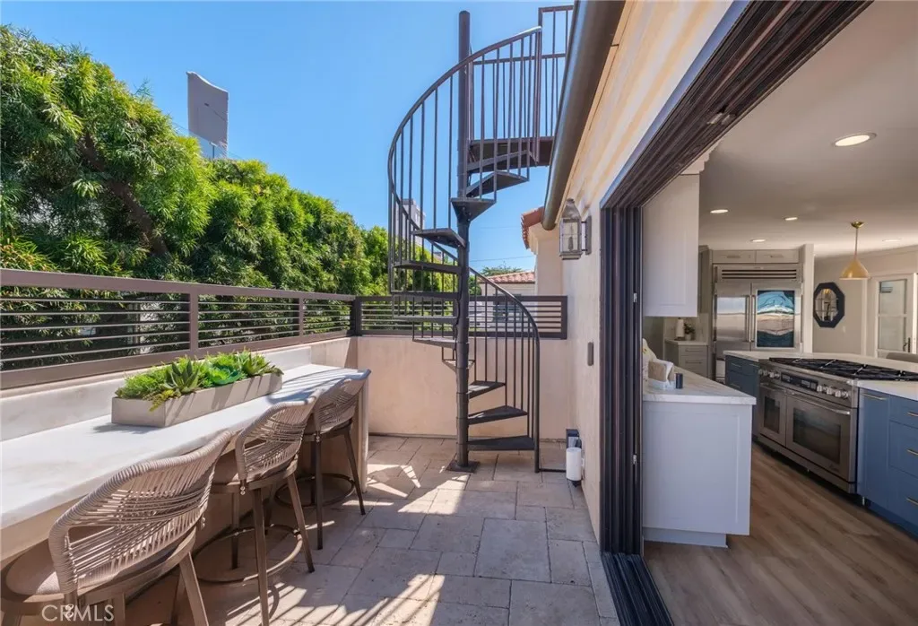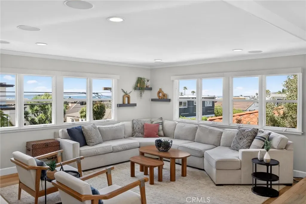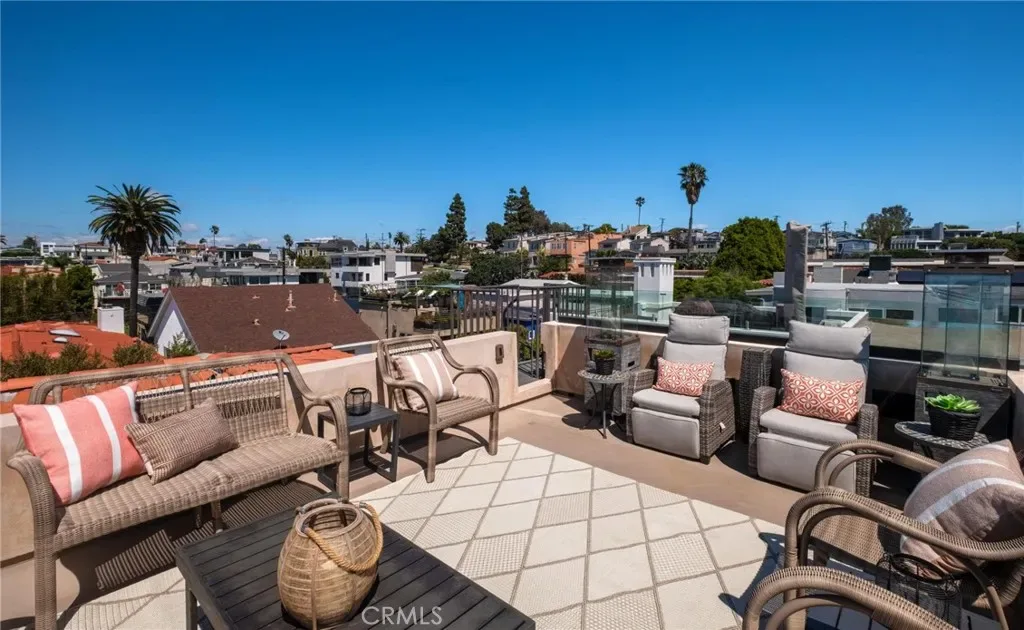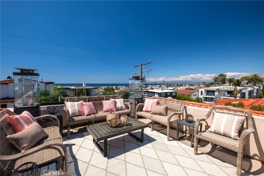 The perfect blend of a beach lifestyle and modern sophistication – this is a unique and rare gem in Hermosa Beach. Perched on an oversized corner lot in the heart of Hermosa Beach, this private coastal villa captures timeless Spanish-inspired architecture through refined design with a curated, modern interior palette. Thoughtful architectural details and warm finishes create an atmosphere that feels both elevated and welcoming. Lush greenery and framed by swaying palm trees, this coastal villa offers the rare combination of resort-inspired living, serenity, thoughtful functionality, privacy, sophistication and timeless appeal. Step through the arched entryway and custom wrought-iron door into a naturally sunlit foyer with soaring ceilings and elegant detailing. The floor plan invites effortless living with multiple indoor-outdoor spaces that capture ocean breezes and golden South Bay natural light. The entry level south wing offers a secluded sanctuary offering a warm stone fireplace, private outdoor veranda and grassy yard, hotel spa inspired bathroom with separate sink counters, primping station, oversized shower and walk-in closet. The north wing has three additional bedrooms, an en suite with outdoor access to spa and patio. The additional two bedrooms are well appointed with ample closet space and share a dual sink bathroom. This wing enjoys a full kitchen offering convenience and privacy for family members and guests, two car garage, laundry room, tool work area and storage. Retreat upstairs to the heart of the home in the warm family room with walls of windows and views that stretch beyond rooftops and spectacular sunsets, built-ins, a dual-sided fireplace that also accommodates the outdoor TV deck. Bask in the sunroom with a wall of western windows plus interior windows inviting ocean breezes and sunlight. Enjoy the open piano area and formal dining room. Relish cooking and entertaining in your gourmet kitchen that includes a 48” SubZero Pro refrigerator, 48” six burner gas cooktop, colossal island that opens seamlessly to a dining area, perfect for gatherings. Outdoor barbeque and bar or up the stairs to ocean views from the rooftop sky deck. Upstairs is a chic yet functional private and spacious office featuring custom cabinetry and bookshelves. Additional highlights – hardwood-like floors, designer lighting, security system and AC. Multiple flexible living areas and decks provide intimate spaces to unwind or host festivities for all lifestyles.