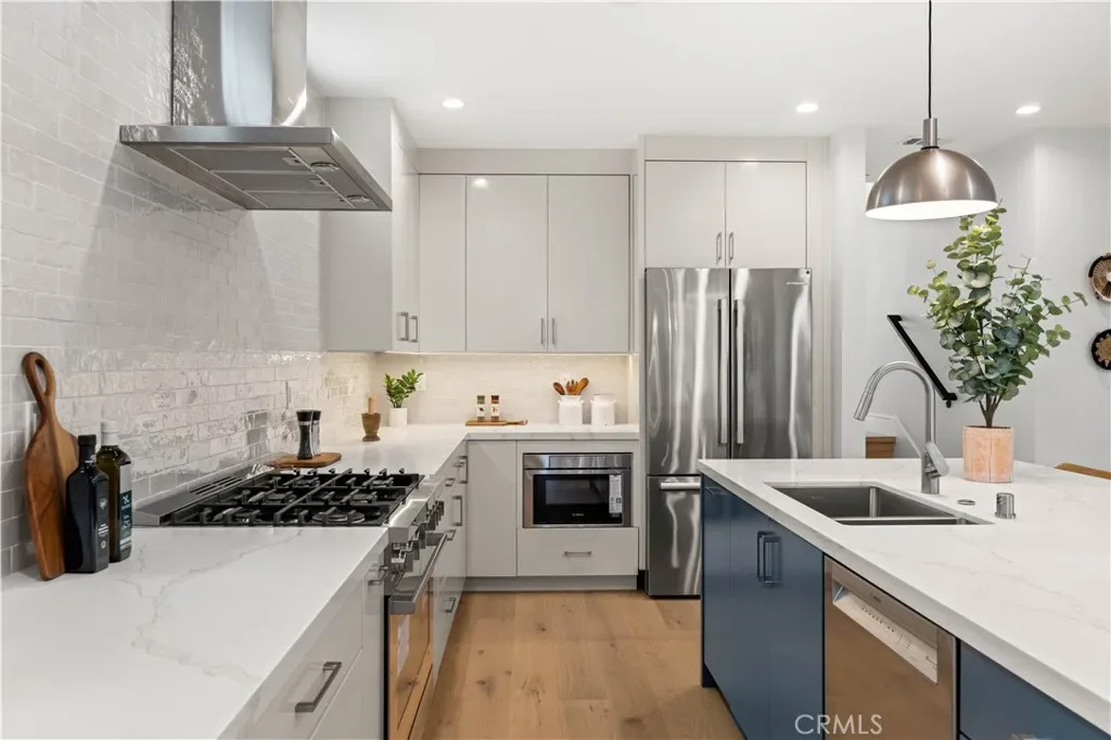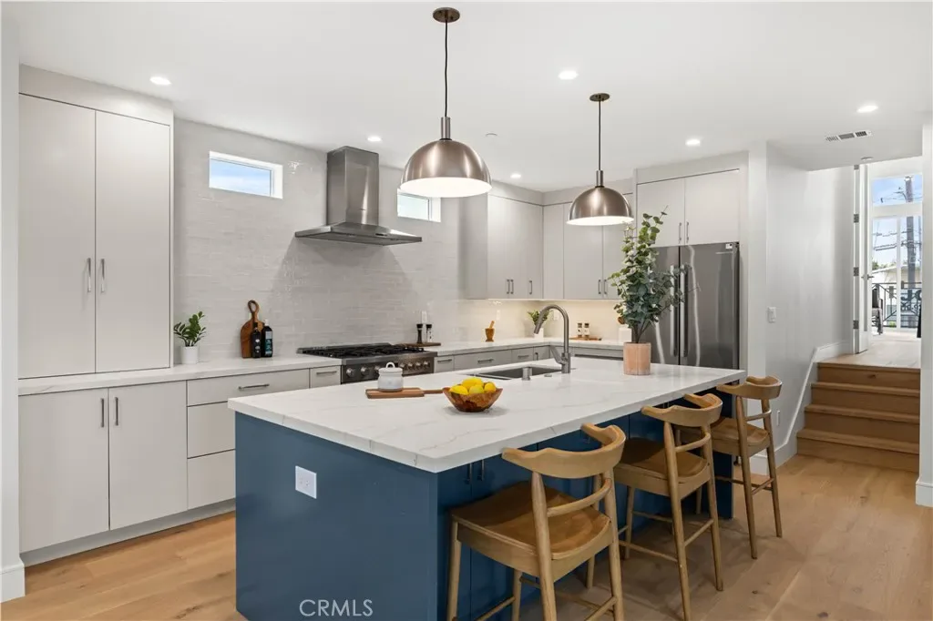 The open-plan interior is anchored by a kitchen that functions as both centerpiece and communal axis. Here, refined materials and custom detailing converge in quiet sophistication. A generous central island serves not only as a practical surface, but as a place of connection—an intentional gathering point within the spatial narrative.