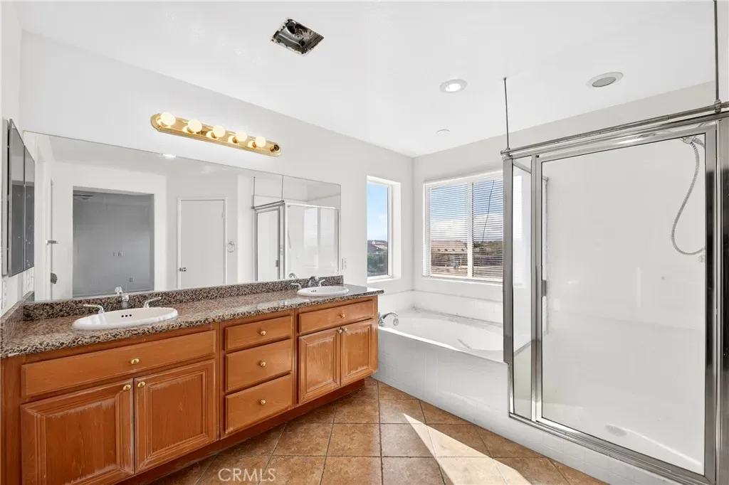 A convenient downstairs bedroom and full bathroom provide flexibility for guests or multi-generational living. Upstairs, you’ll find a generous loft space ideal for a home office, media room, or play area. The primary suite boasts a well-appointed bathroom with a separate tub and shower for added luxury.