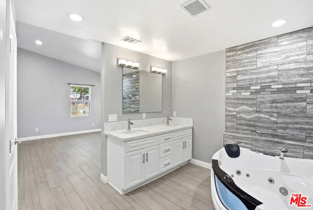 Welcome to this beautifully refreshed Hesperia home offering space, style, and flexibility. Featuring an open floor plan and two private primary suites on opposite sides of the home, this layout is ideal for multigenerational living, guests, or added privacy. The oversized kitchen is a standout with extensive cabinetry, expansive counters, and a seamless flow into the living area. The spacious primary suites feature spa-inspired bathrooms with dual vanities and a soaking tub. Additional highlights include an indoor laundry room, detached garage, and fenced dog area. With generous interior spaces and a versatile lot, this property offers the comfort and function today’s buyers are looking for.