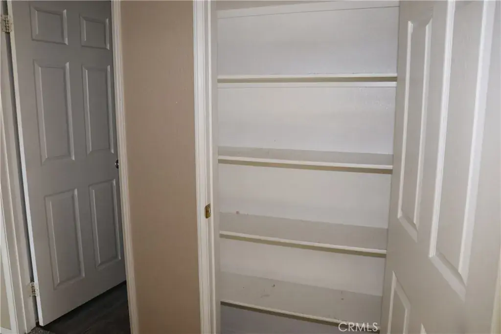 and a large L shape garage with shelfs and side door to exit without open the big garage door