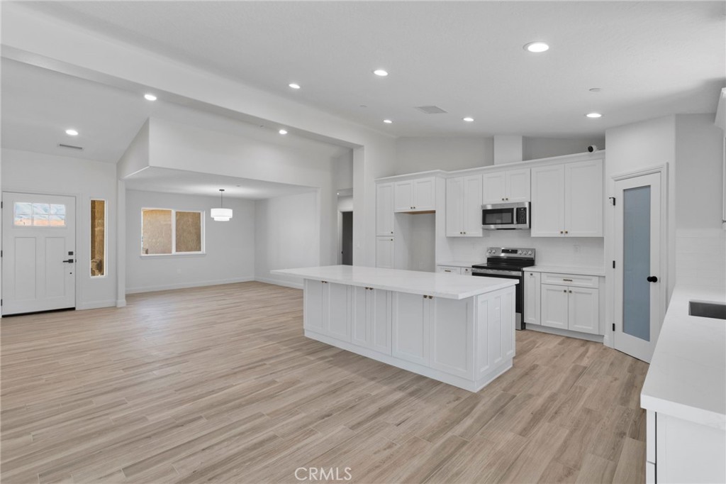 The kitchen is designed to be the heart of the home. A large quartz island anchors the space, offering plenty of room for cooking, gathering, and entertaining. You’ll also find matching quartz countertops, stainless steel electric appliances, and a spacious walk in pantry that keeps everything organized and easily accessible. Just off the kitchen, a formal dining area provides the perfect setting for hosting dinners or special occasions.
