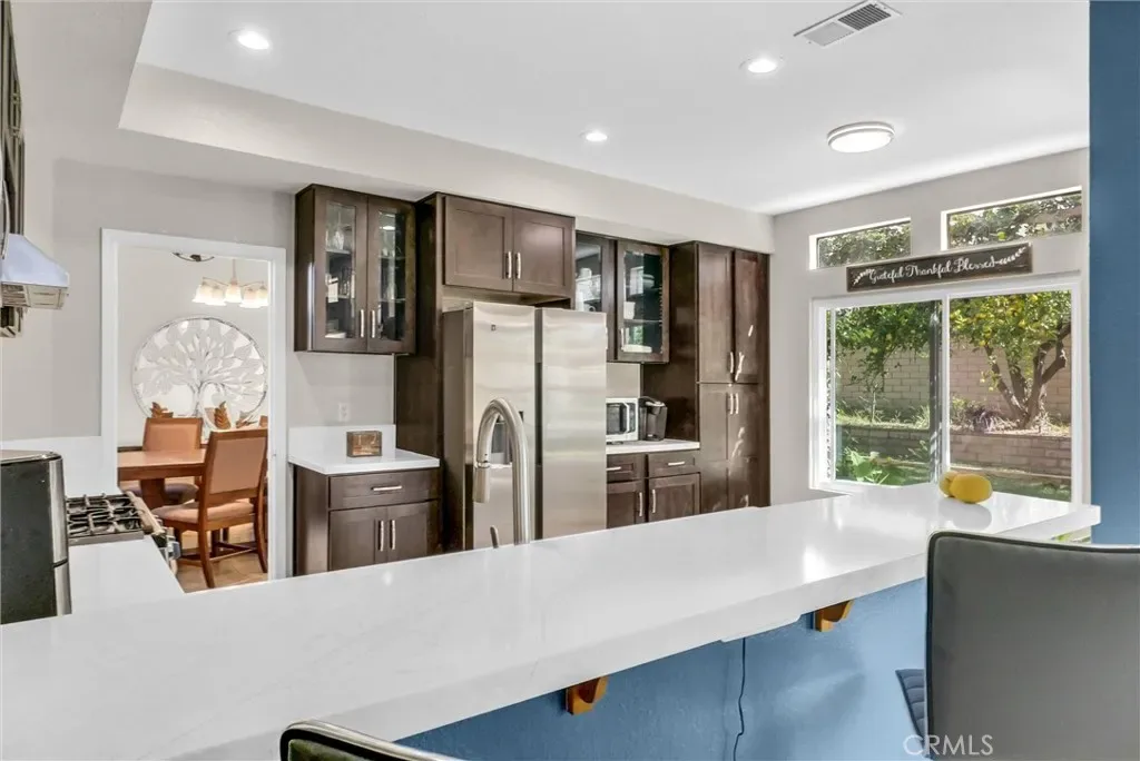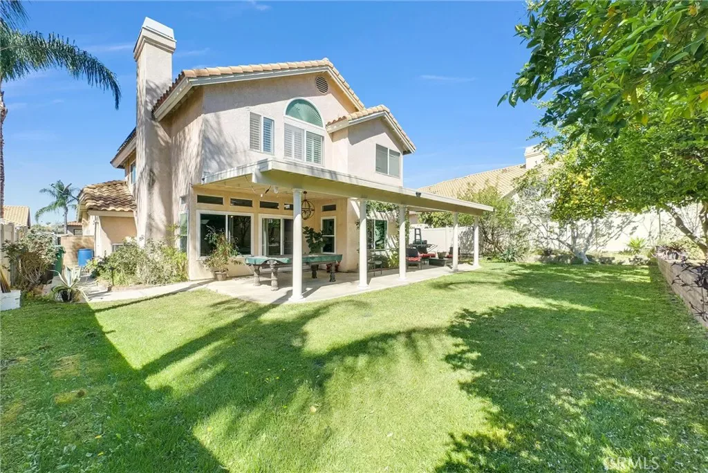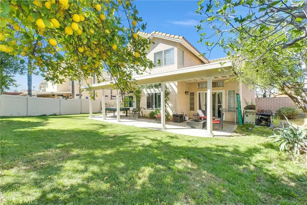 Step outside to a peaceful backyard adorned with lush landscaping, mature lemon and orange trees, and a charming outdoor patio, creating a serene setting for relaxing or hosting gatherings.