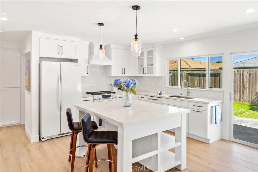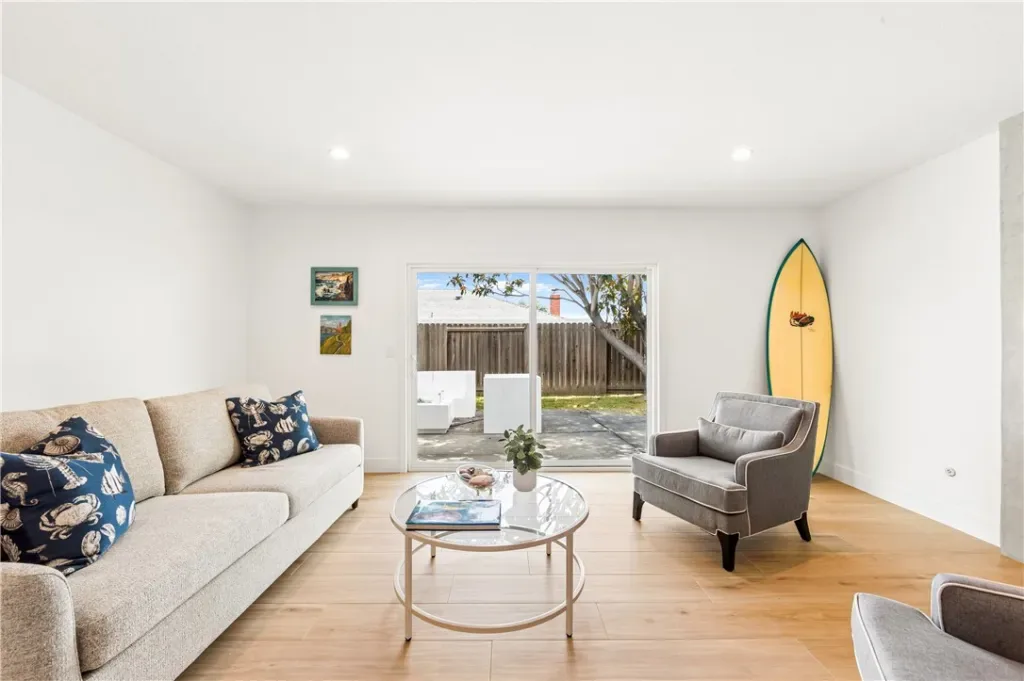 Boutique Hotel Vibes. LOCATION, LOCATION, LOCATION. One and a half miles to the beach, and just a half mile to acclaimed Edison High School. This single-story, 4 bed/2 bath home with 2-car garage is a completely RENOVATED MID-CENTURY GEM on a quiet, interior lot. Professionally designed, light, bright, and magazine-worthy, with new porcelain wood-look floors from Spain, new windows, recessed lighting, and fresh paint throughout. HUGE DREAM KITCHEN (21′ x 17′) with marble counters, custom island, morning light, and built-in dry bar with wine fridge. Living room features an artisan-created Venetian plaster fireplace. Both bathrooms updated, including custom tile. ALL BRAND NEW APPLIANCES, including washer/dryer (separate indoor laundry room). Backyard features original HAND-PAINTED MURAL by well-known local artist, mature trees, and fire pit. Rare turnkey opportunity- hurry, won’t last!