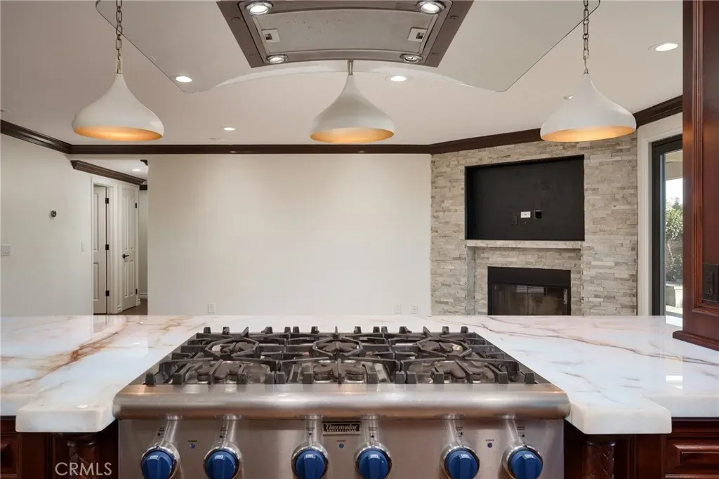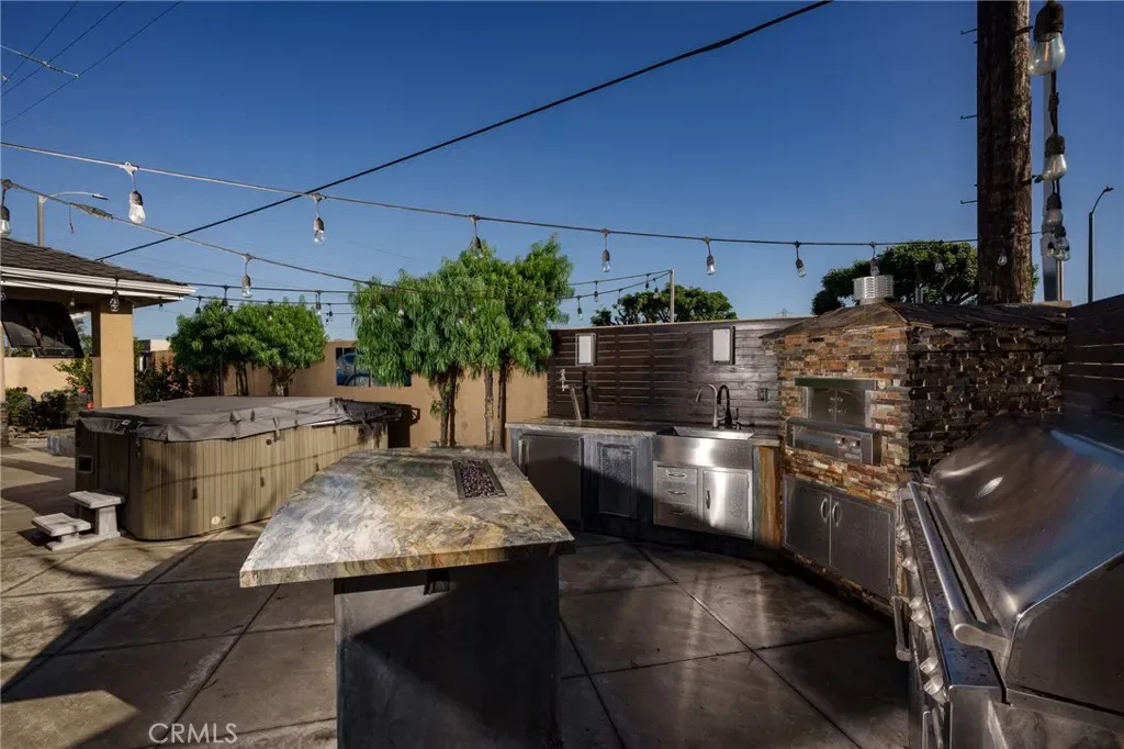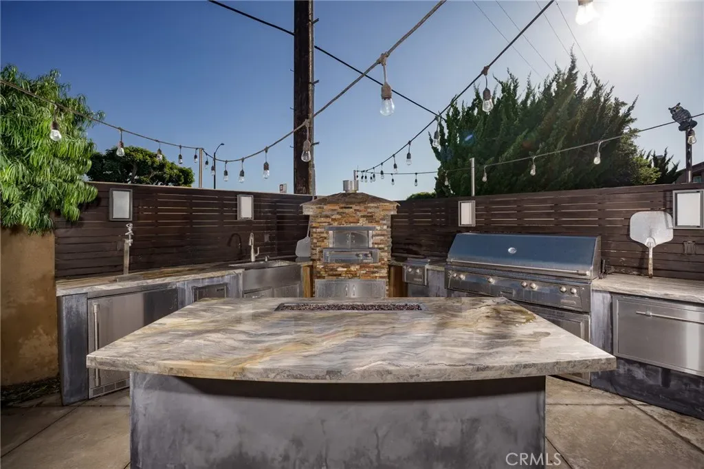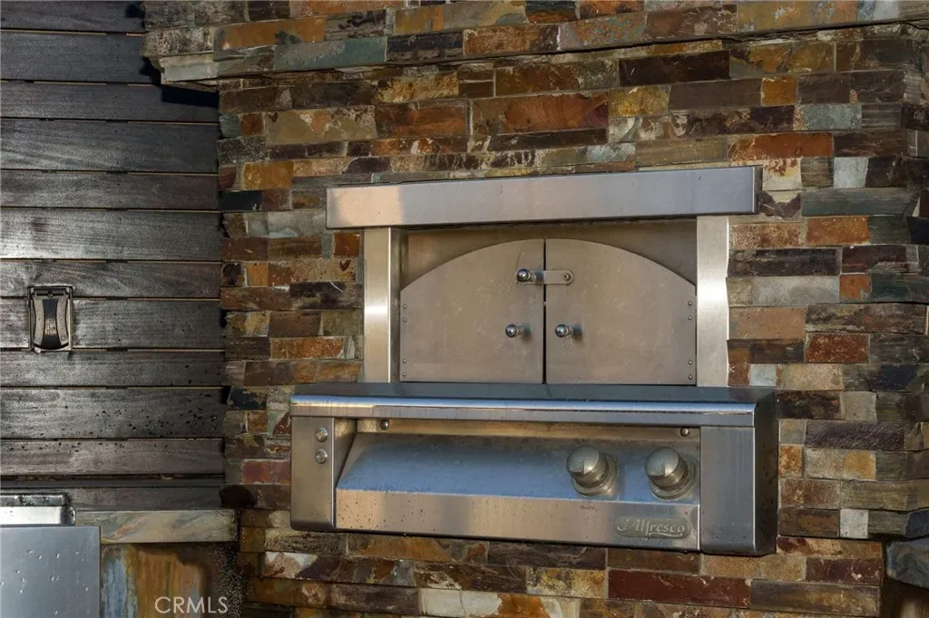 Back yard with a very nice Spa and TV, 58″ built in natural gas BBQ Alfresco brand with sear zone, built in natural gas side burners, Built in natural gas pizza oven, Full functioning sink, Warming Drawers, Refrigerator and refrigerant drawers, Natural stone island and fire feature, Full overhead exterior open room with roof, Bromic heaters, fan and speakers system, Added independent fire feature, Waterfall pond, Landscape lighting.