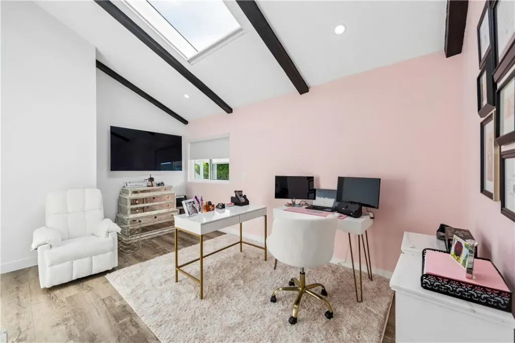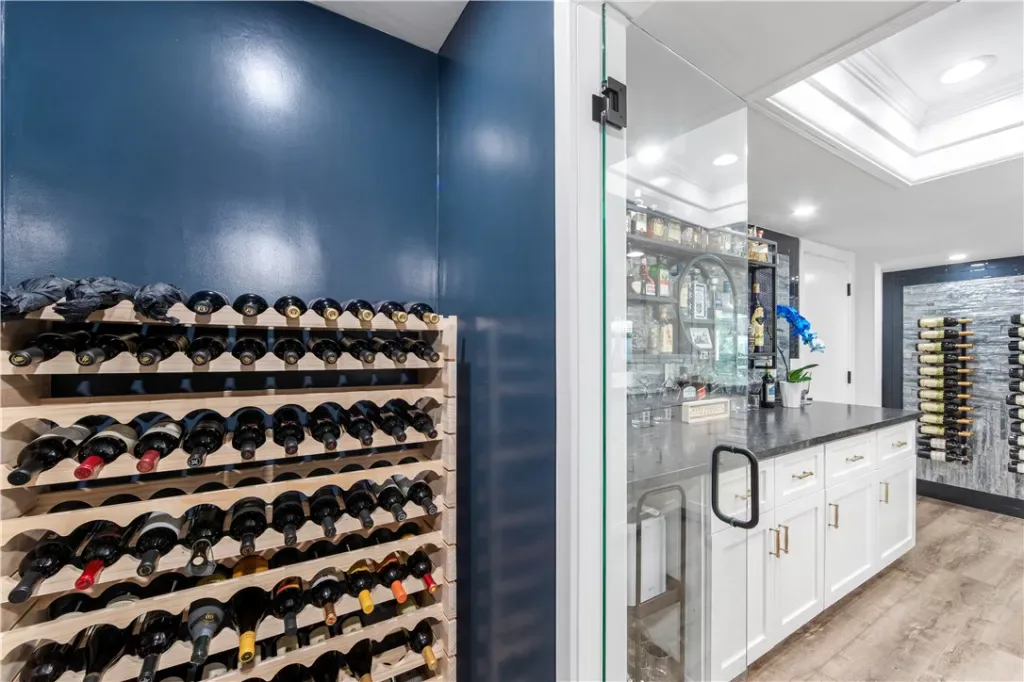 The chef’s kitchen features custom cabinetry, a 6-burner Viking range, warming drawer, and a large island perfect for gathering. The adjacent family room opens to an impressive 1,000 sq. ft. addition with open beam vaulted ceilings, dual skylights, and a spacious great room. This unique space includes a secondary kitchen/bar with full-size refrigerator, wine room, custom cabinetry, and leathered countertops, along with a private staircase leading to a versatile bonus room or 5th bedroom—ideal for a nursery, possible ADU or multi-generational living.