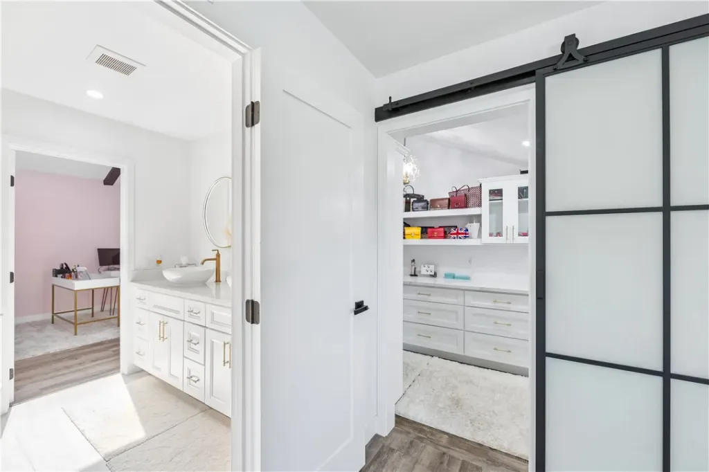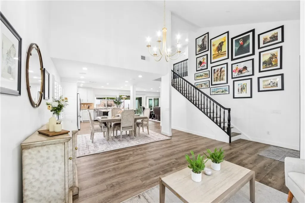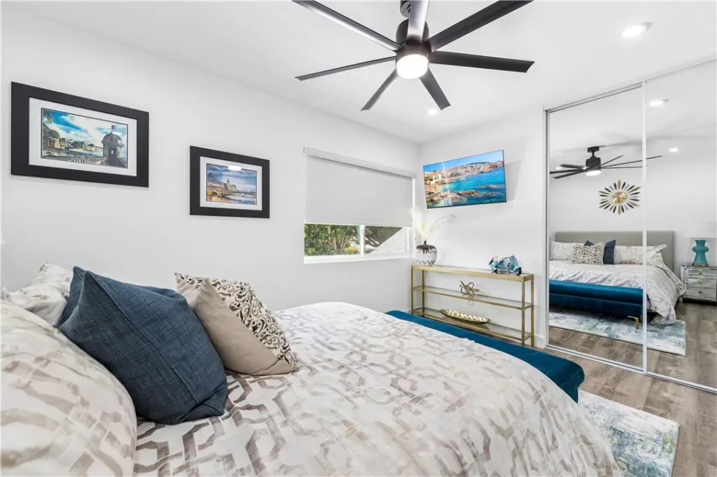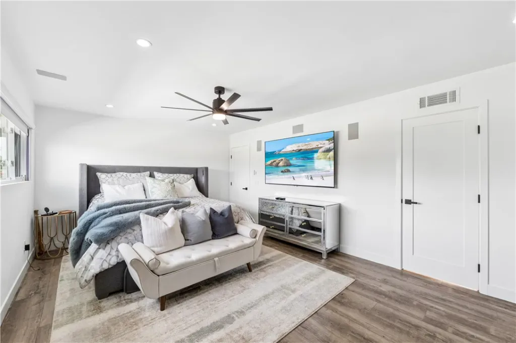 Inside, vaulted ceilings and expansive windows fill the home with natural light. Upgrades include brand-new luxury vinyl flooring throughout, fresh trim, recessed LED lighting, plantation shutters, and built-in custom California closets in every room. The open yet functional floor plan is ideal for both everyday living and entertaining.