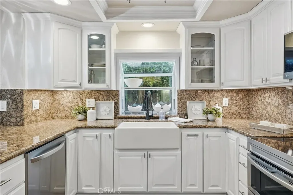 The main level includes defined yet connected living spaces ideal for both daily living and gatherings. The kitchen is appointed with painted cherry wood cabinetry, granite countertops, and new smart stainless steel appliances. Dual-pane windows and an updated water heater and heating system contribute to overall efficiency and comfort.