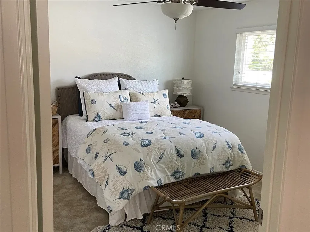 Both bedrooms feature carpet flooring, with the spacious primary bedroom offering a walk-in closet and mounted TV for added comfort and convenience.