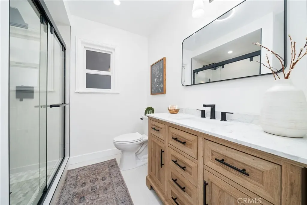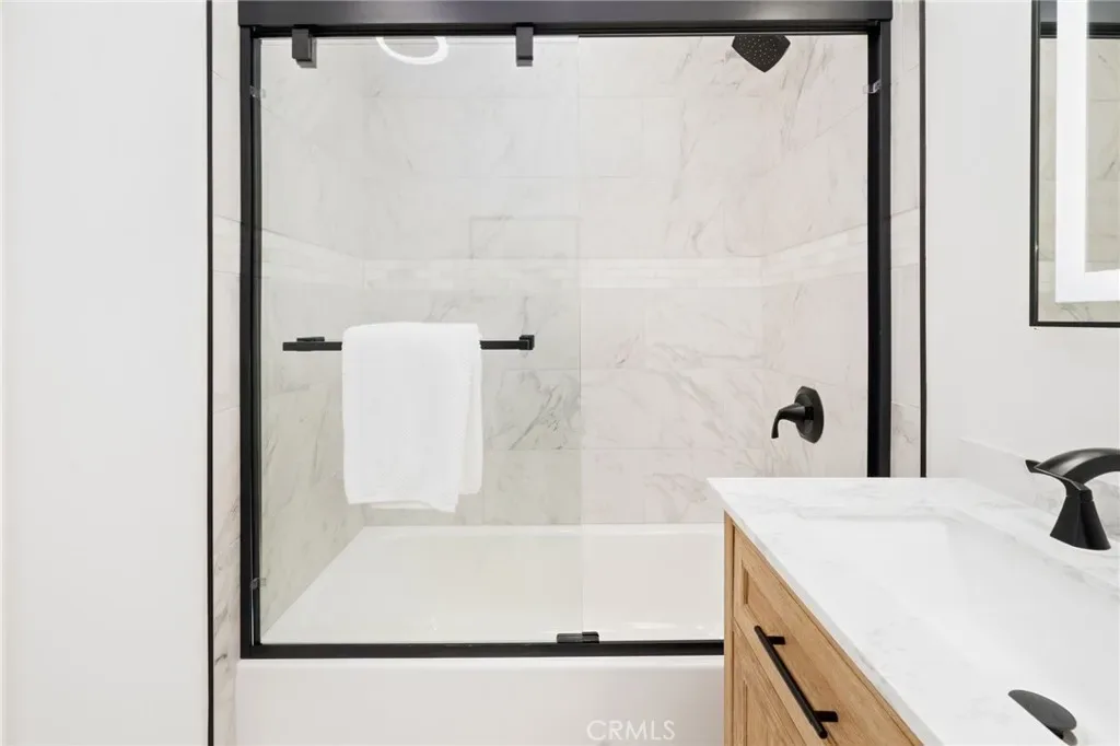 Both bathrooms have been completely remodeled with quality finishes, including natural stone elements, premium 3/8-inch glass shower doors, Bluetooth speaker exhaust fans, and durable fixtures designed for everyday comfort.