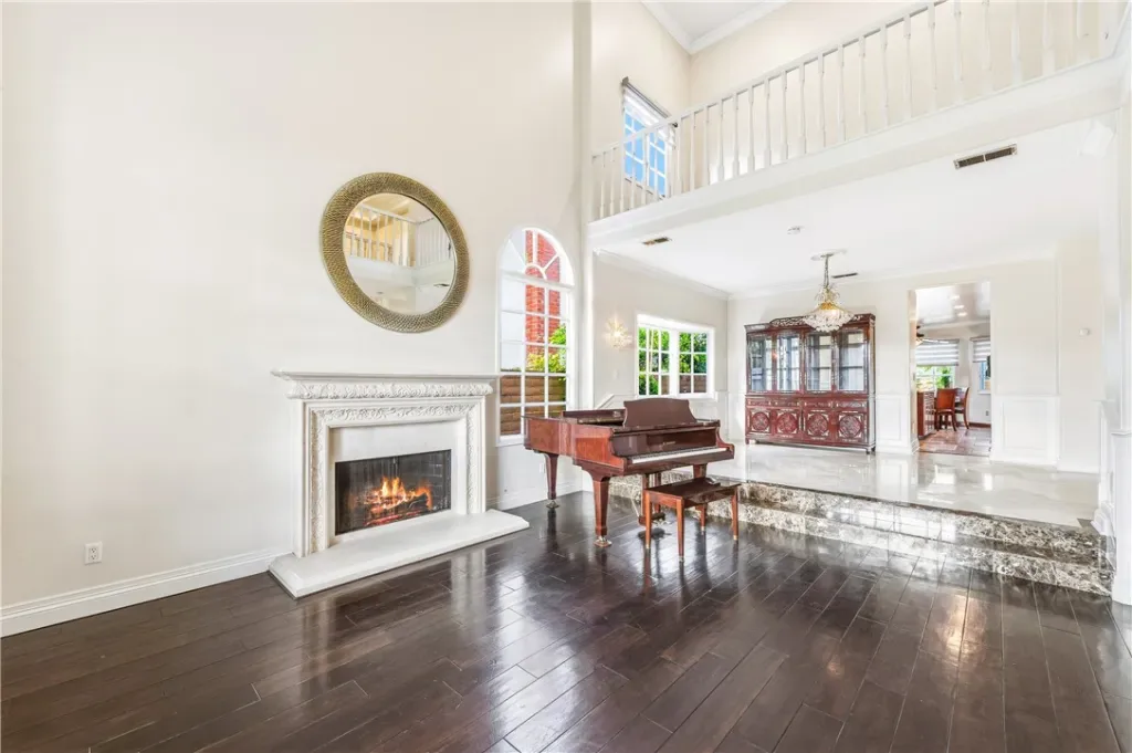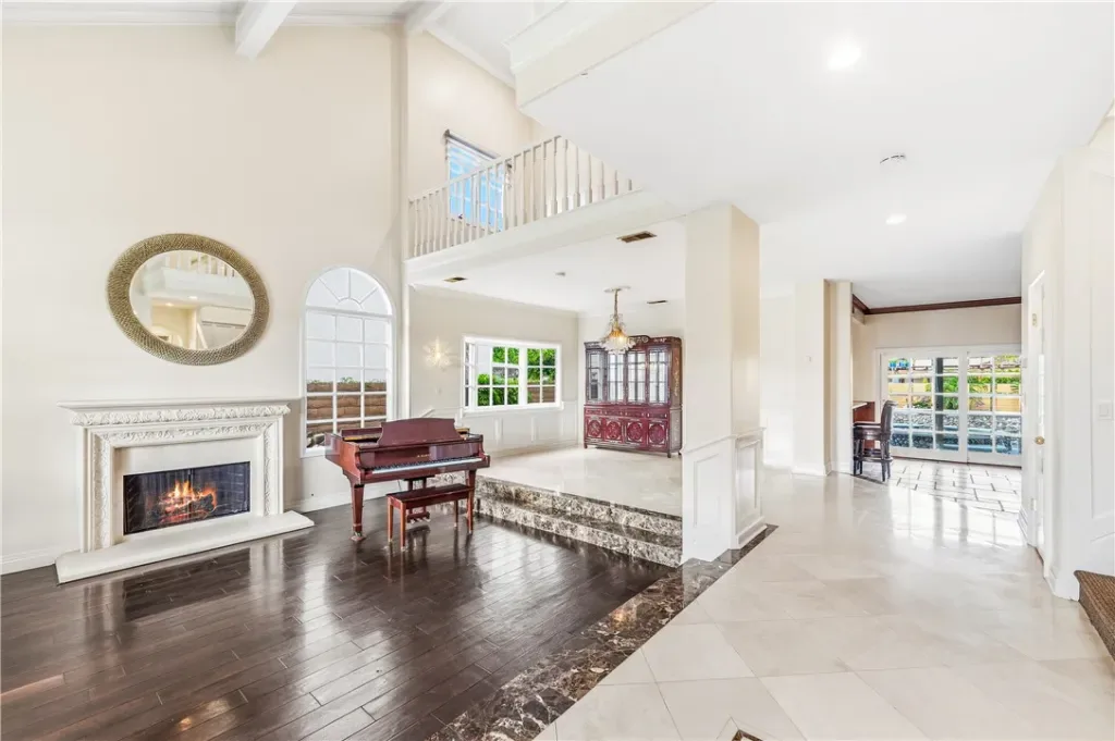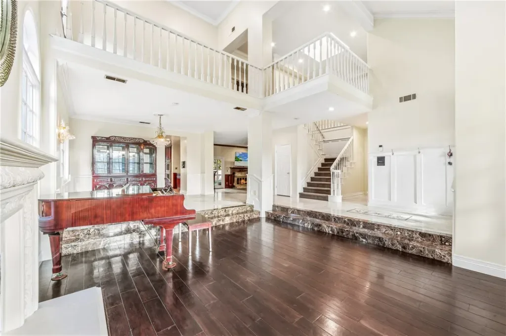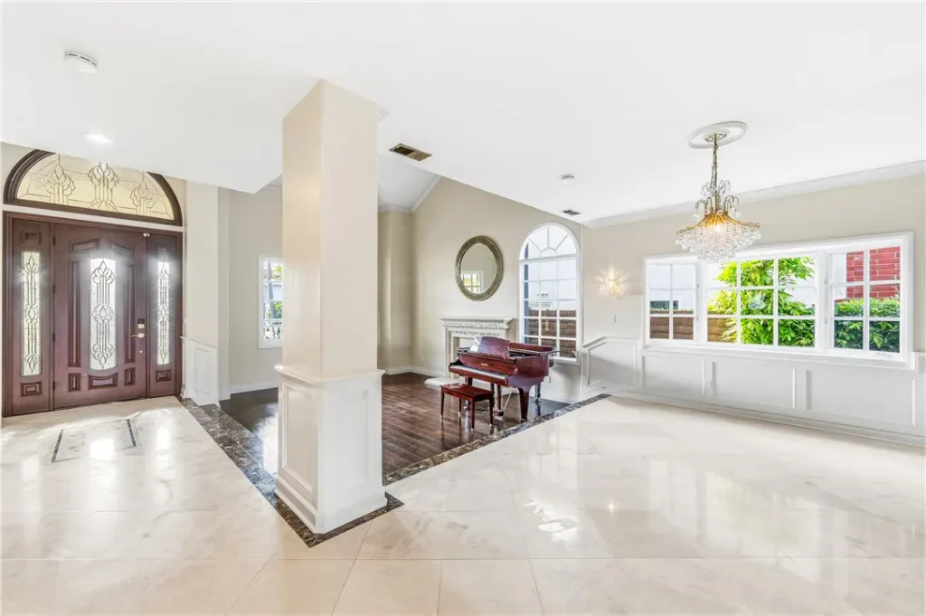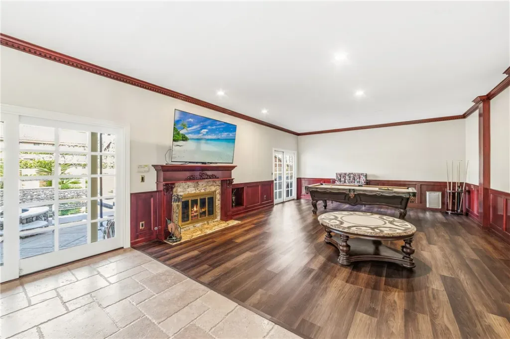 Elegant interior features limestone, granite, and hardwood flooring, soaring ceilings, and refined architectural details. Highlights include a step-down living room with fireplace and baby grand piano, formal dining room with crystal chandelier, and spacious family/game room with pool table.