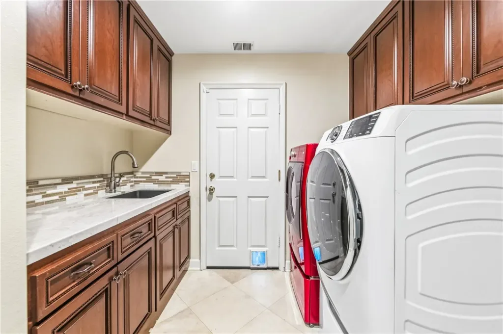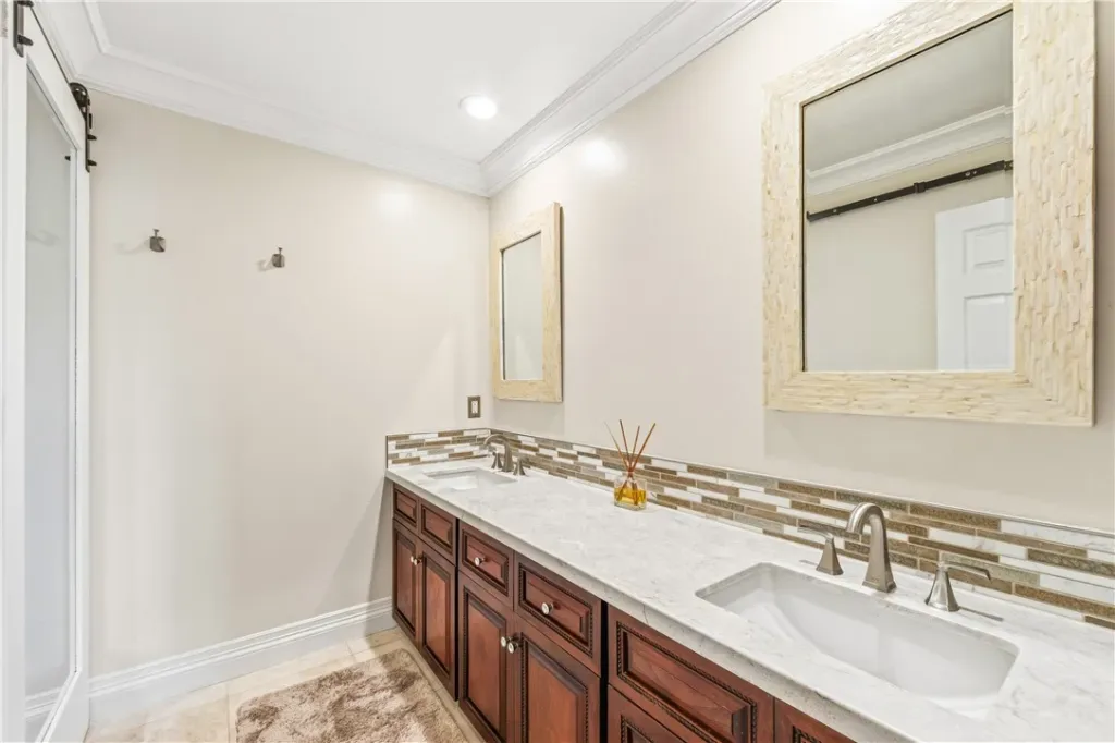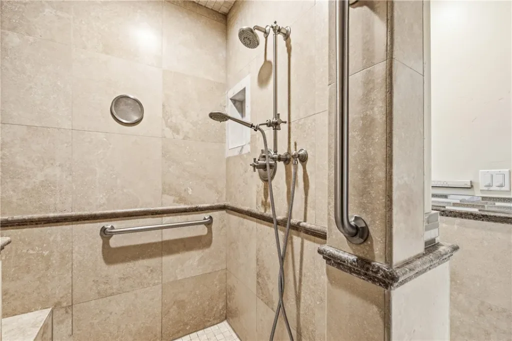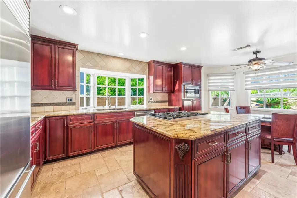 Gourmet kitchen boasts Thermador double ovens, Viking gas cooktop and microwave, Bosch dishwasher, Sub-Zero refrigerator, wine fridge, and additional refrigeration in the garage.