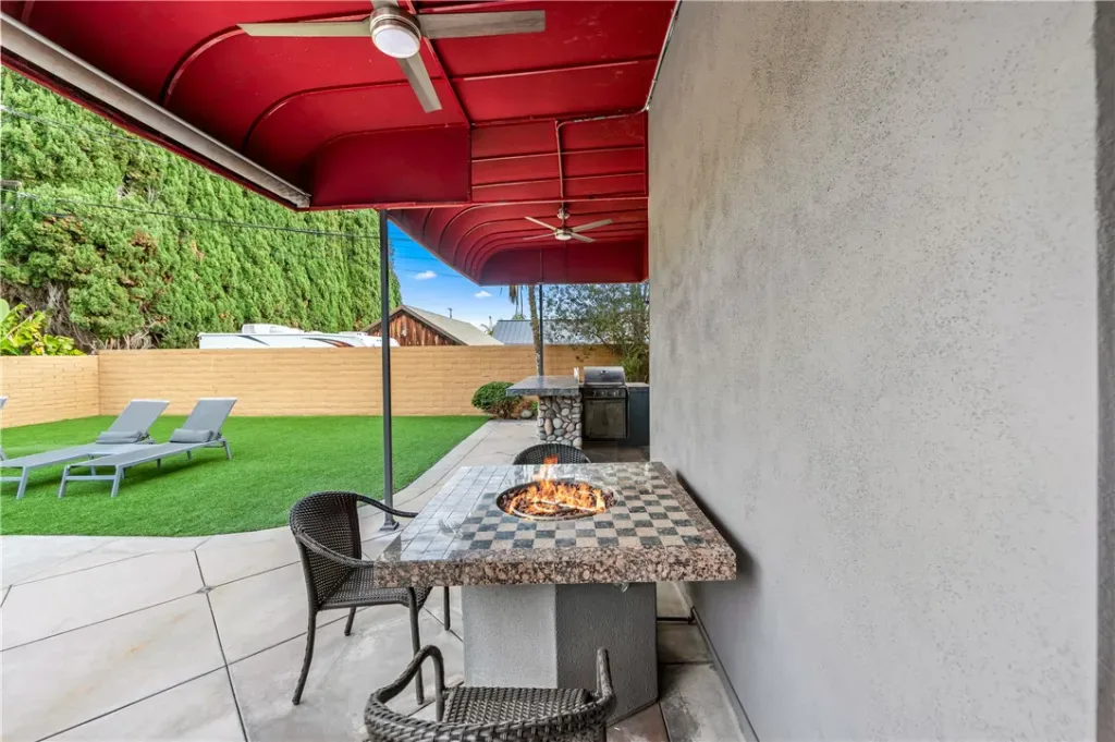 Resort-style backyard features pool, spa, BBQ/bar area, and multiple seating spaces. Additional amenities include three fireplaces, three TVs, solar panels, dual-zone HVAC, whole-house water filtration, and covered front porch.
