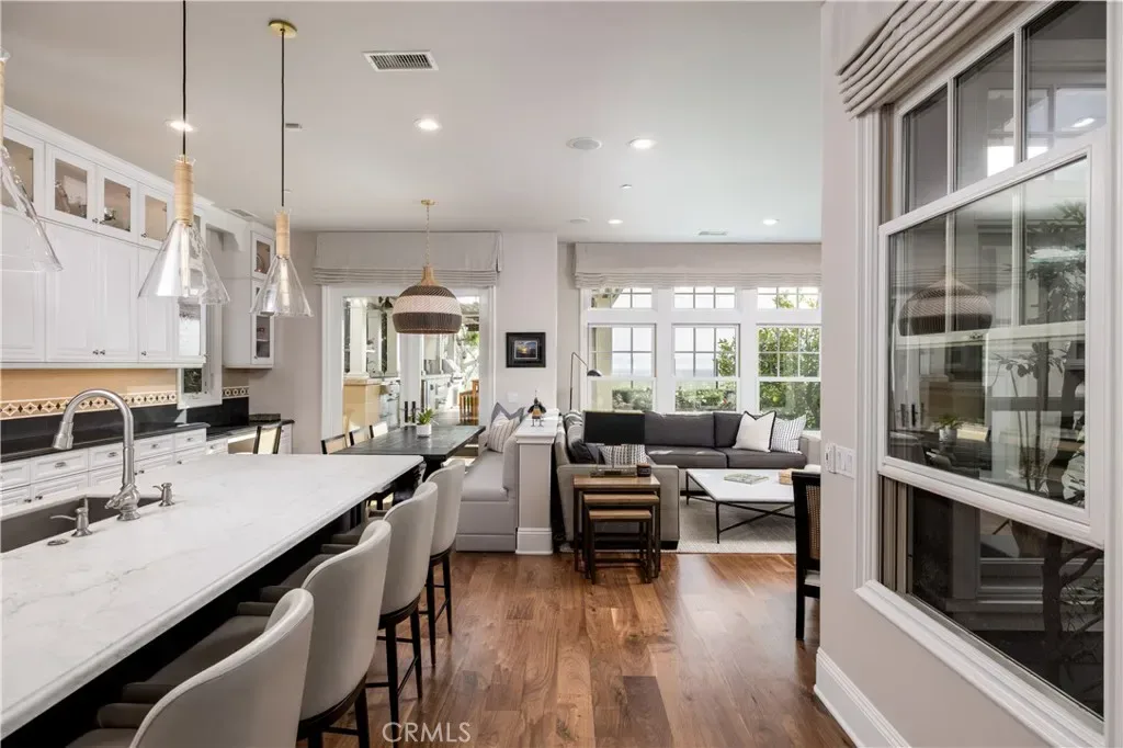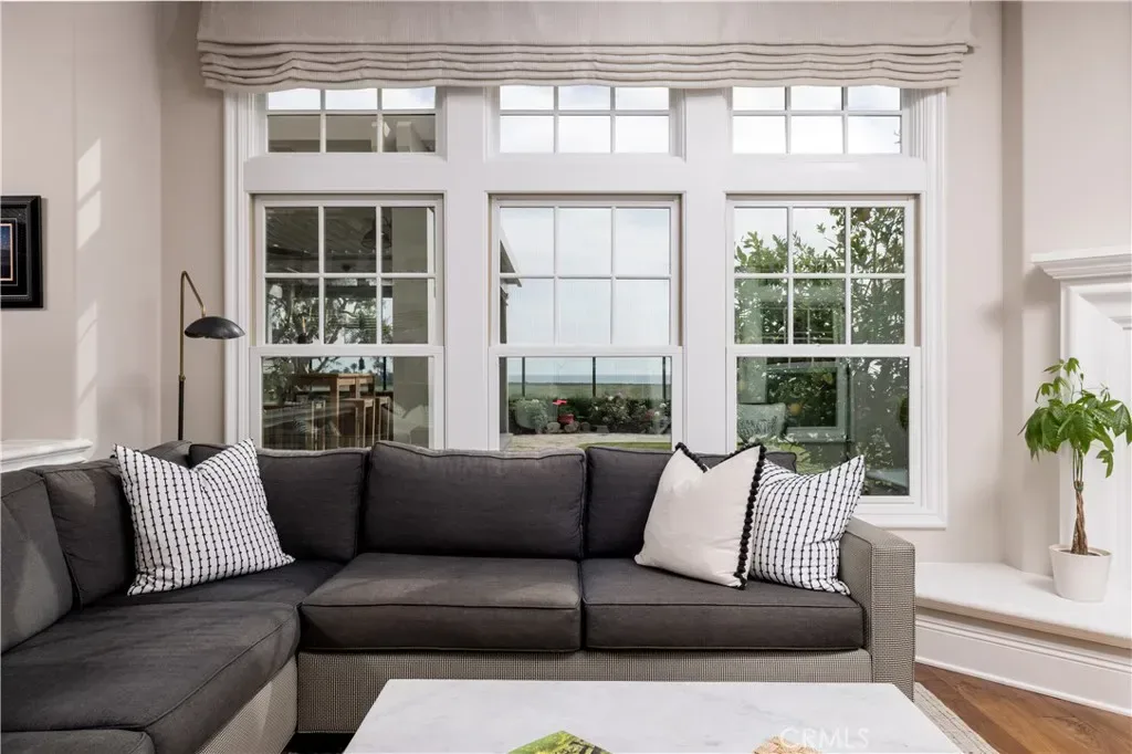 Wake up to expansive coastal views and ocean breezes in a rare architectural gem, an original Hearthside Home Breakers Plan 2, uniquely positioned at the north end on the coveted view side of Brightwater Drive, the “Gold Coast” of the beautiful Brightwater neighborhood. This stunning home features a timeless East Coast design evoking Nantucket and Martha’s Vineyard. Designed for indoor-outdoor living, the home’s gathering spaces are seamlessly connected for a natural flow. Arrive at the welcoming covered front porch – complete with swing and come through the “Dutch” front door and office French doors into the main living spaces. Adjoining living room and dining roomwith a cozy fireplace provide flexible entertaining space, while more French doors from the kitchen and family rooms lead you to wander: settle into the cozy, private courtyard, or venture beyond to the backyard where you will be entranced by sit-down ocean views and a rare orientation that offers a sunset scene 365 days per year! On one of the larger lots in the area, it features 5 bedrooms and 4.5 baths, plus a dedicated office, a large upstairs bonus room, casita with separate entry, and 3 upstairs balconies including two larger decks with ocean views. This former model features too many enhancements to name: extensive built-ins, wainscoting throughout, striking beamed ceilings, luxury appliances – TWO full-size Sub-Zero refrigerators, wine storage, Sonos audio and more. The crisp palette of black & white with warm neutrals, is as fresh as the ocean air, and showcases the recent extensive renovation of bathrooms and interior spaces including refinished natural walnut flooring, designer paint, refreshed kitchen island and lighting, smart motorized shades, window coverings and carpet. The spacious backyard is anchored by a covered BBQ area on a raised deck featuring motorized louver systems, fans, and heaters, to optimize outdoor enjoyment in any weather. The premium BBQ, kegerator, ice maker, fridge, warming & storage drawers,sink with prep space & trash pullout, and expansive counter space create a true outdoor kitchen. Make memories around the inviting fire pit. Water features, grass lawn & mature fruit trees complete the private, resort-style setting. An (ocean view!) garage and a porte-cochère with an oversized driveway provide ample parking.This is a rare opportunity to own a premier view property in one of Huntington Beach most sought-after coastal communities.