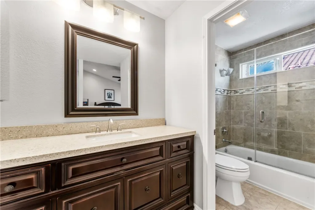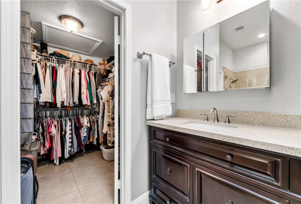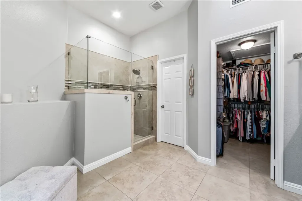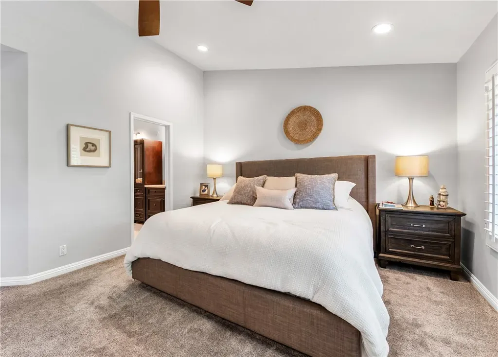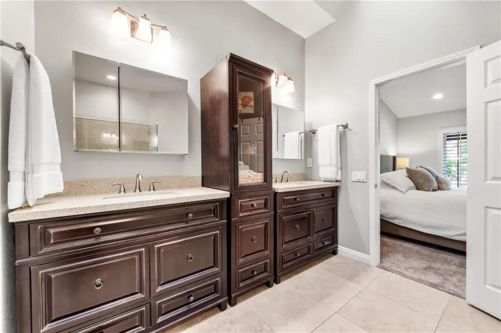 Downstairs, you’ll find a private guest suite with a sleek, modern en-suite bathroom, a dedicated laundry room with ample storage, and direct access to your two-car garage. Head upstairs to discover soaring vaulted ceilings and two more generously sized bedrooms, including a luxurious primary suite with a spacious reading nook, a spa-like bathroom with dual vanities and an enviable walk-in closet.