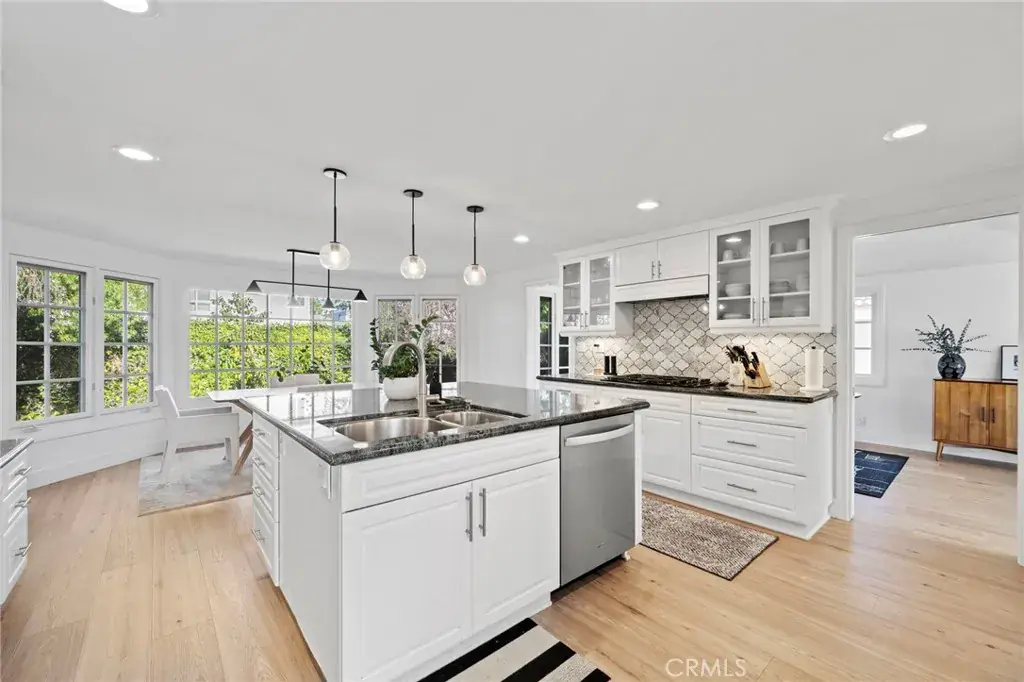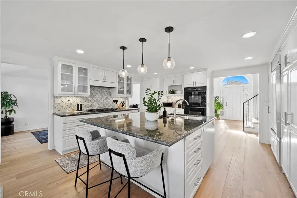 Welcome to this beautifully expanded and reimagined Helmsman Model in the highly desirable Park Huntington neighborhood of South Huntington Beach. Situated on a quiet interior street, this 3-bedroom, 3-bathroom home offers nearly 2,400 square feet of thoughtfully designed living space. A gated and landscaped front yard with a large patio creates a welcoming first impression. Enter through a custom front door into a formal entry highlighted by dramatic vaulted, beamed ceilings and warm hardwood floors throughout the main living areas. The formal living and dining rooms flow seamlessly into a chef’s kitchen featuring a large center island, Sub-Zero refrigeration, double ovens, four-burner gas cooktop, stone countertops, designer tile backsplash, and custom lighting. The kitchen overlooks an oversized breakfast nook and the beautifully manicured backyard. Just below, the cozy family room offers a gas fireplace, wet bar, and adjacent powder bath—ideal for everyday living and entertaining. Upstairs, the expanded and fully remodeled primary suite is a true retreat with a spacious walk-in closet, dual-sink vanity with waterfall marble countertop, and an oversized walk-in shower with dual shower heads. Two additional bedrooms, a full bathroom with tub, and a dedicated laundry room complete the upper level. Additional highlights include newer air conditioning, an electric vehicle charger, and a private backyard with mature fruit trees—perfect for outdoor entertaining. Located within award-winning school districts and just a short walk to Whole Foods, Sprouts, Target, and popular dining. Enjoy easy access to Pacific City, downtown Huntington Beach, and the beach, just a short bike ride away.