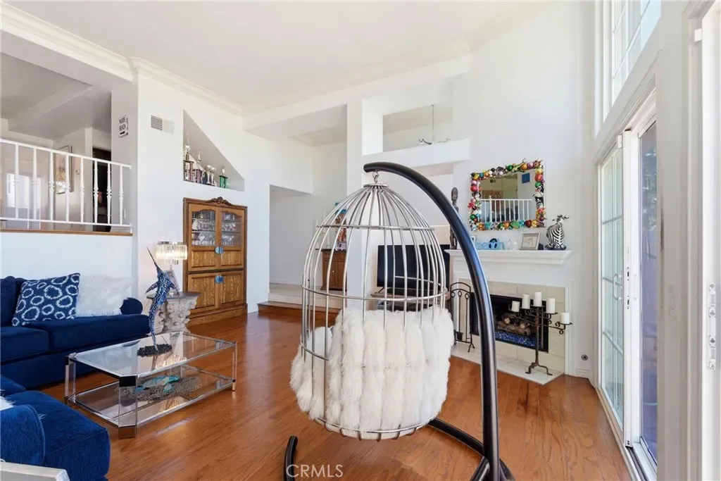 Inside, the home offers a bright and open floor plan designed for both comfort and entertaining. The spacious living room features soaring ceilings, a beautiful fireplace, and dual sliding glass doors that open to an inviting outdoor space, seamlessly blending indoor and outdoor living.