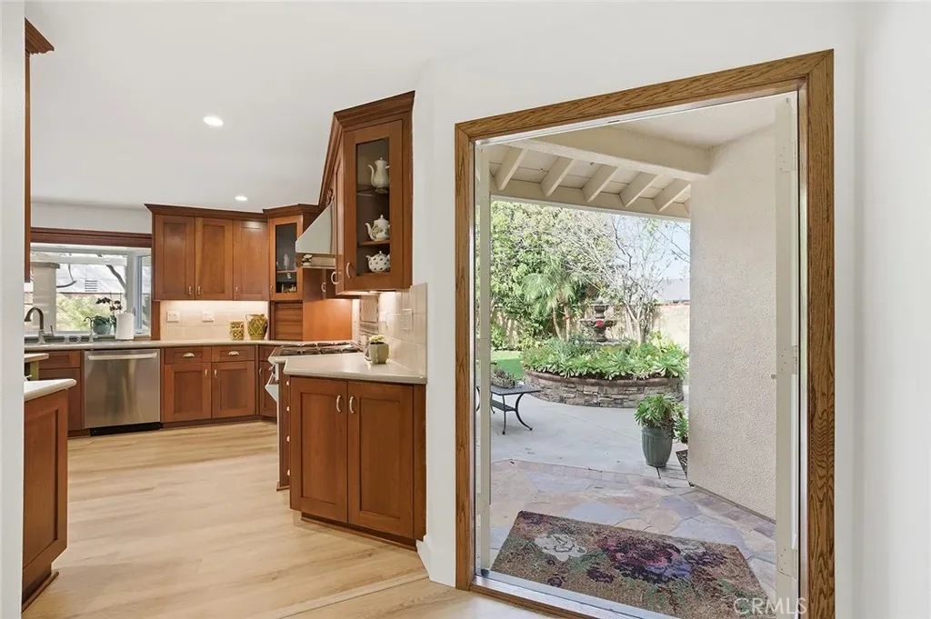 Vaulted ceilings and skylights fill the living room with natural light, creating a bright and inviting space that transitions effortlessly into the formal dining area with French doors leading to the backyard. Designed for both relaxation and entertaining, the outdoor space features a fire pit, covered patio, custom landscape lighting, and a fully equipped outdoor kitchen with a Bull BBQ and beverage refrigerator—all enhanced by refreshing ocean breezes.